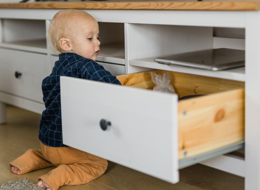 A felfedező utak áldozatai lehetnek továbbá a szekrényekben vagy fiókokban tárolt tárgyak, eszközök is. Nem szerencsés, ha ezekben olyan dolgokat tárolunk, amelyekhez a babánknak legkevésbé sem kellene hozzáférnie, mint például a gyógyszerek vagy a tisztítószerek. Annak érdekében, hogy gyermekünk semmiképpen se férjen hozzá ezekhez, szereljünk zárakat a szekrények ajtajára és a fiókokra. Ezzel azt is megakadályozhatjuk, hogy a baba odacsípje a kezét, vagy esetleg magára rántsa egy-egy fiók tartalmát.