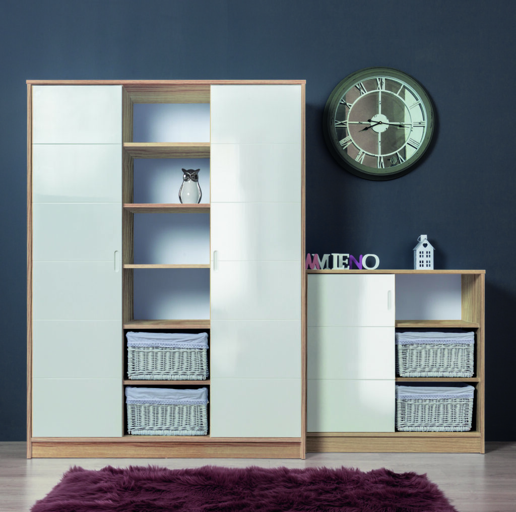 A classic piece of furniture radiating warmth. The body of the Alda Classic furniture, made from Coimbra wood-effect boards, gives the range a traditional and well-loved appearance. The glossy sliding doors glide smoothly from one side to the other, quietly revealing access to the clothes stored inside.