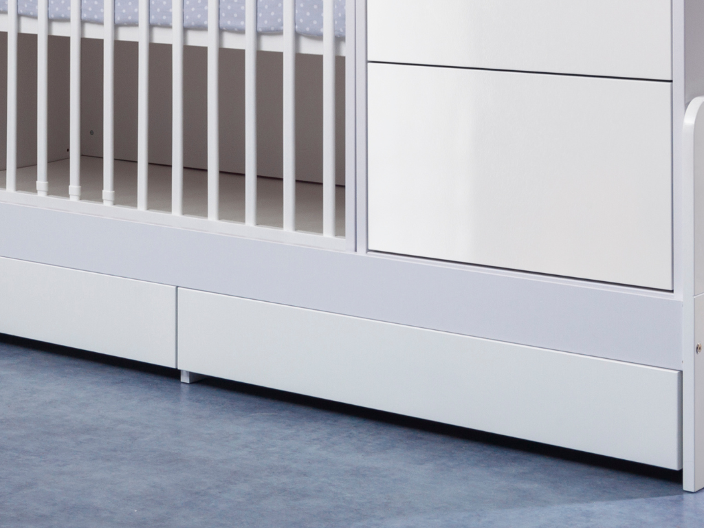 A well-proven design dressed in a pure, radiant look. The popular Alda Ice White sliding-door Wardrobes provide generous storage space in the nursery while maintaining full functionality even in smaller rooms. The radiant white furniture elements and the high-gloss fronts visually enlarge the space and bring a touch of festivity to even the greyest of weekdays. Practical storage baskets balance this sense of refinement, turning the Alda Ice White nursery into a simply charming and lovable home.