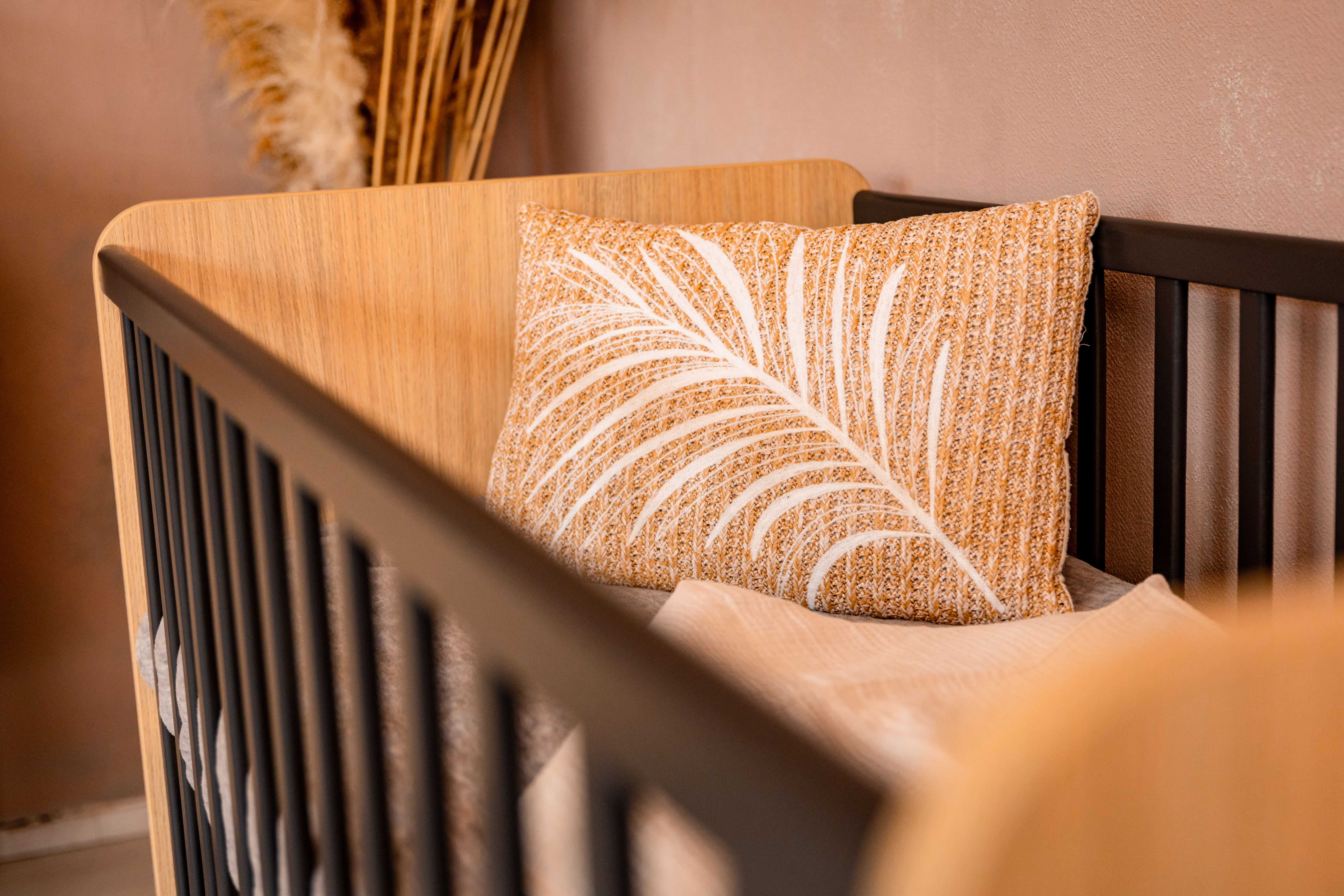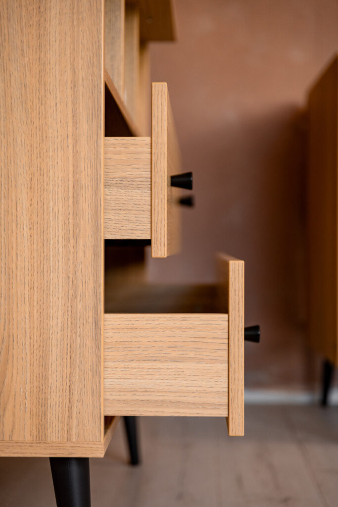 Calma Oak is a truly distinctive and unique furniture collection that brings a modern retro vibe into the nursery. The pieces are made from light Dylan Oak furniture board, enhanced by black accessories that evoke a loft style. Standing on black legs, the furniture is crowned with elegant black handles and the stylish black side rails of the cots.