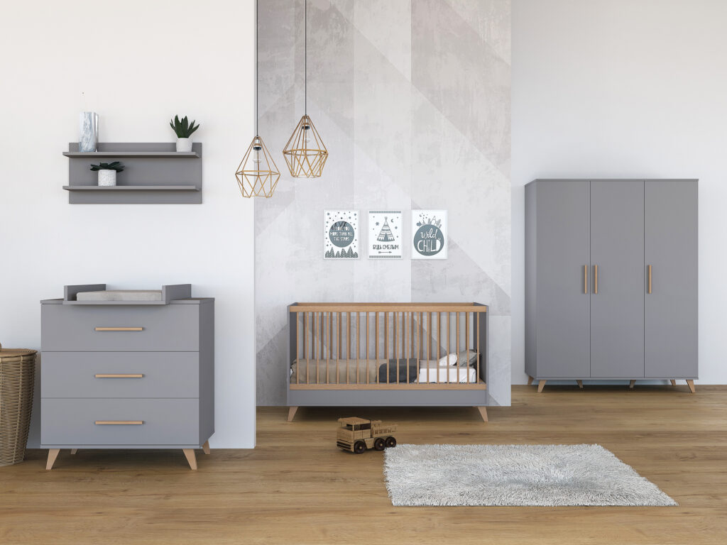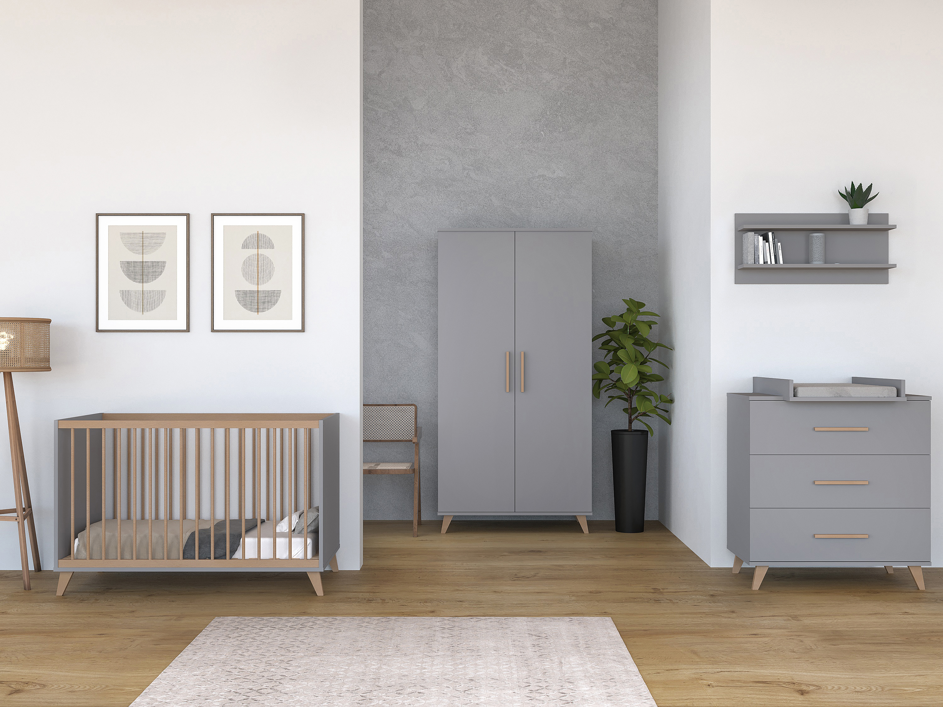 The predominantly grey surfaces of the furniture are complemented by warm, oak-effect elongated handles and elegant legs, as well as the side rails of the beds. This combination is not only visually distinctive but also enhances the feeling of cosiness. The elongated handles running across the Chests and Wardrobes bring the design features of modern urban interiors into the nursery.