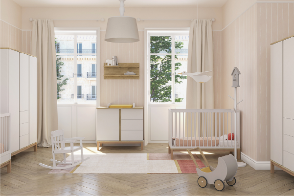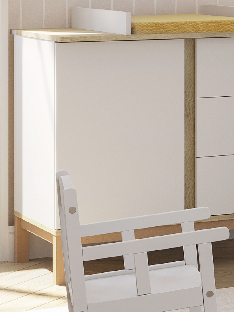 Loop's furniture range made of ice white and Natur Arwen oak veneer is an excellent choice for those who like modern, minimalist style furniture. Thanks to its special design, the drawers and doors can be opened at the vertical divisions, so the fronts are not divided by the handles, thus strengthening the clean overall effect.