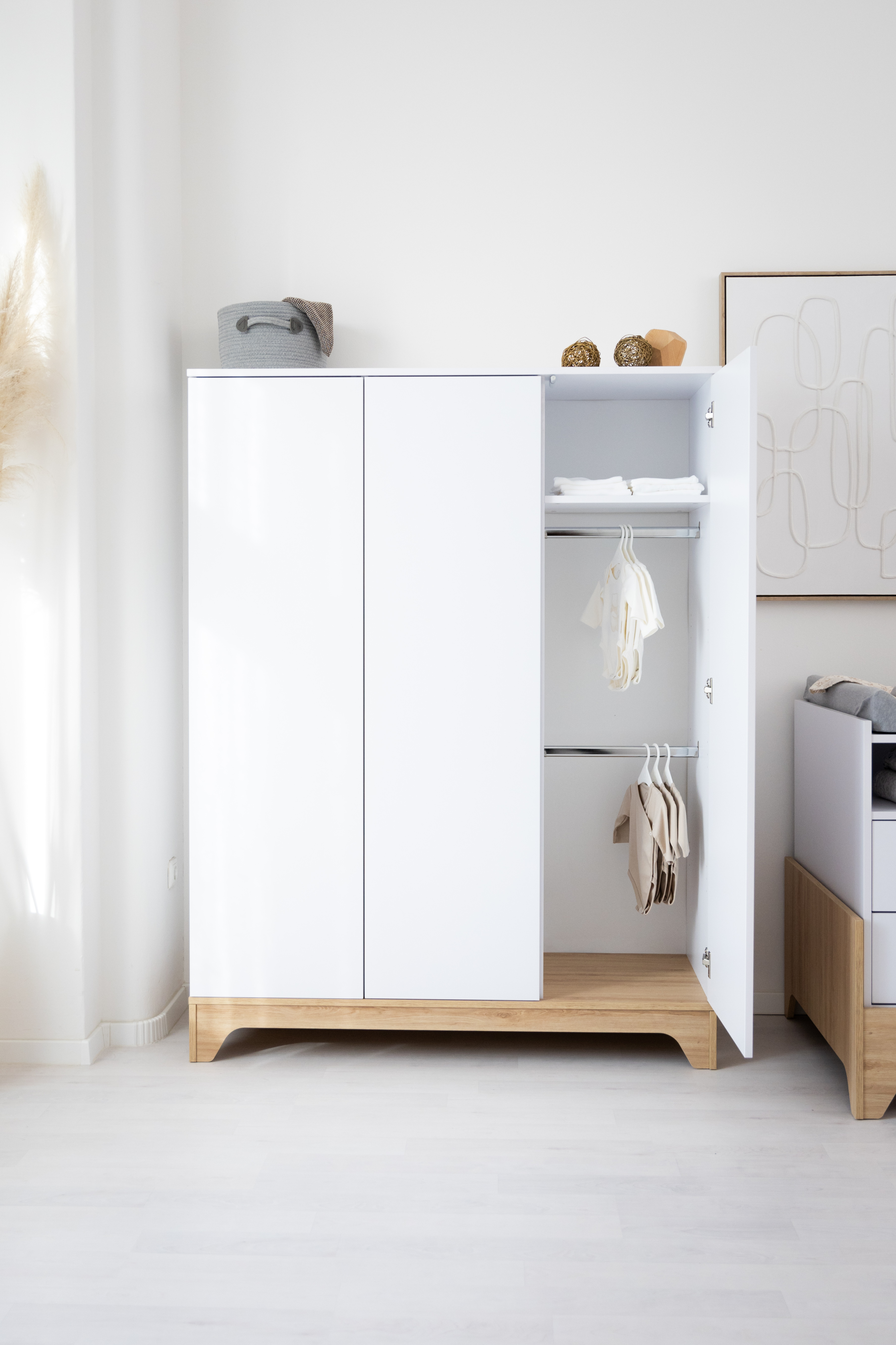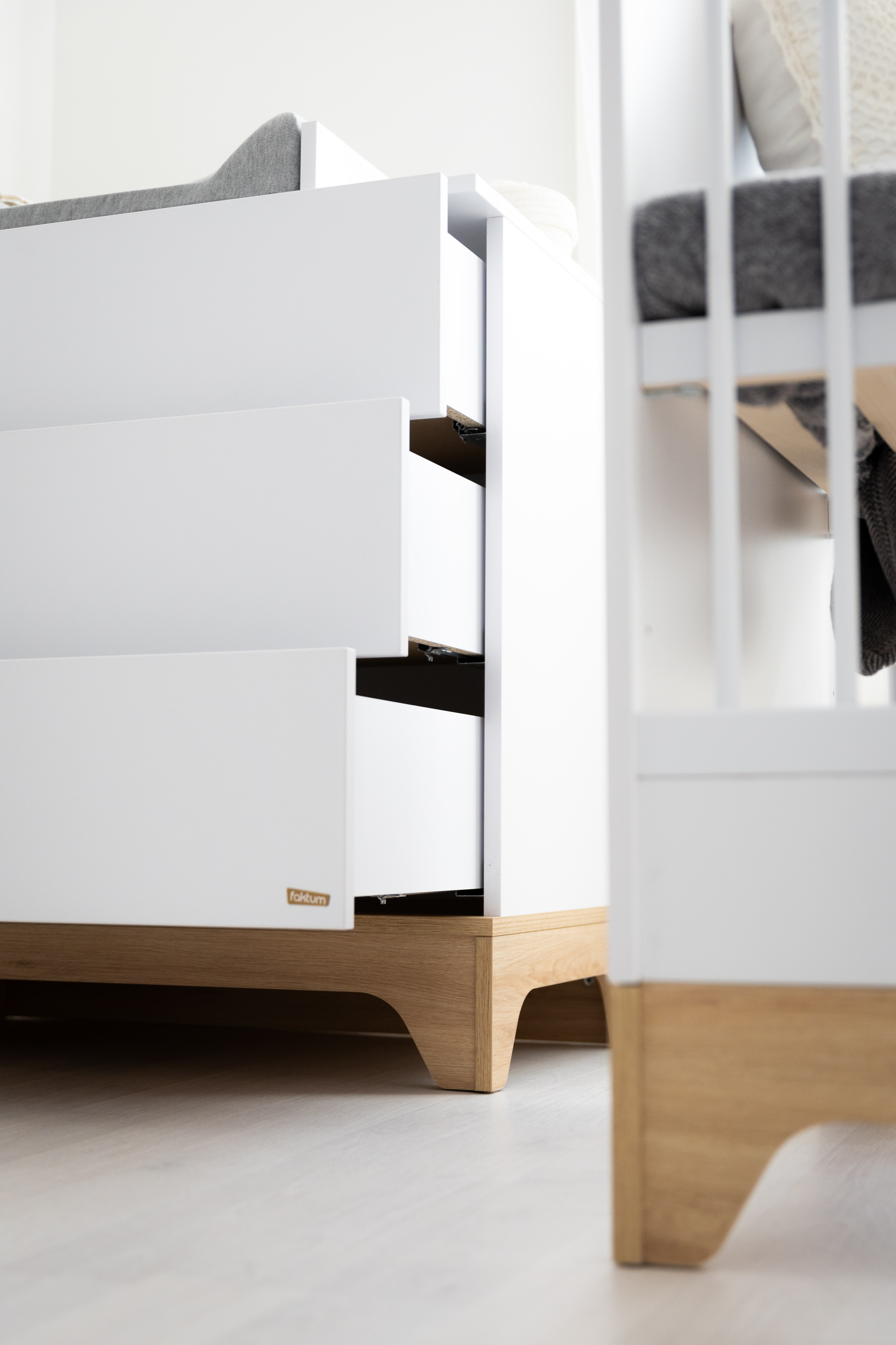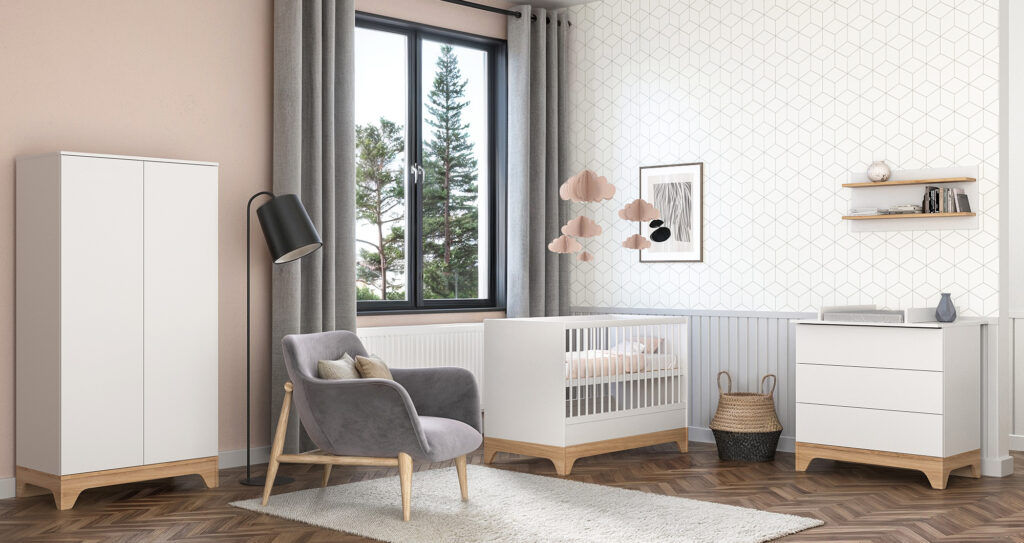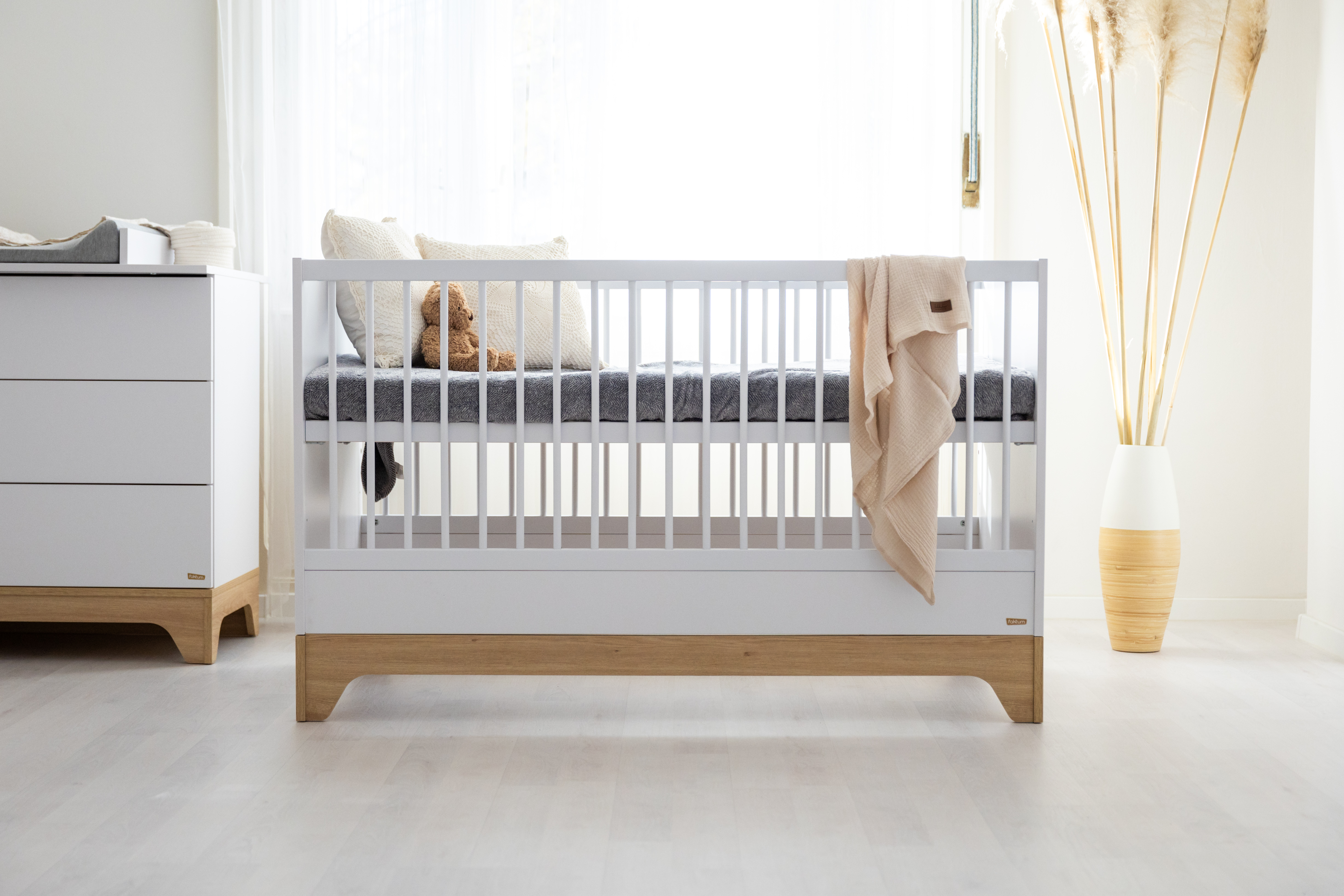 With its clean design and modern lines, it is a favorite among contemporary parents, while its color scheme — the harmony of white and natural wood grain — fits perfectly into almost any nursery.