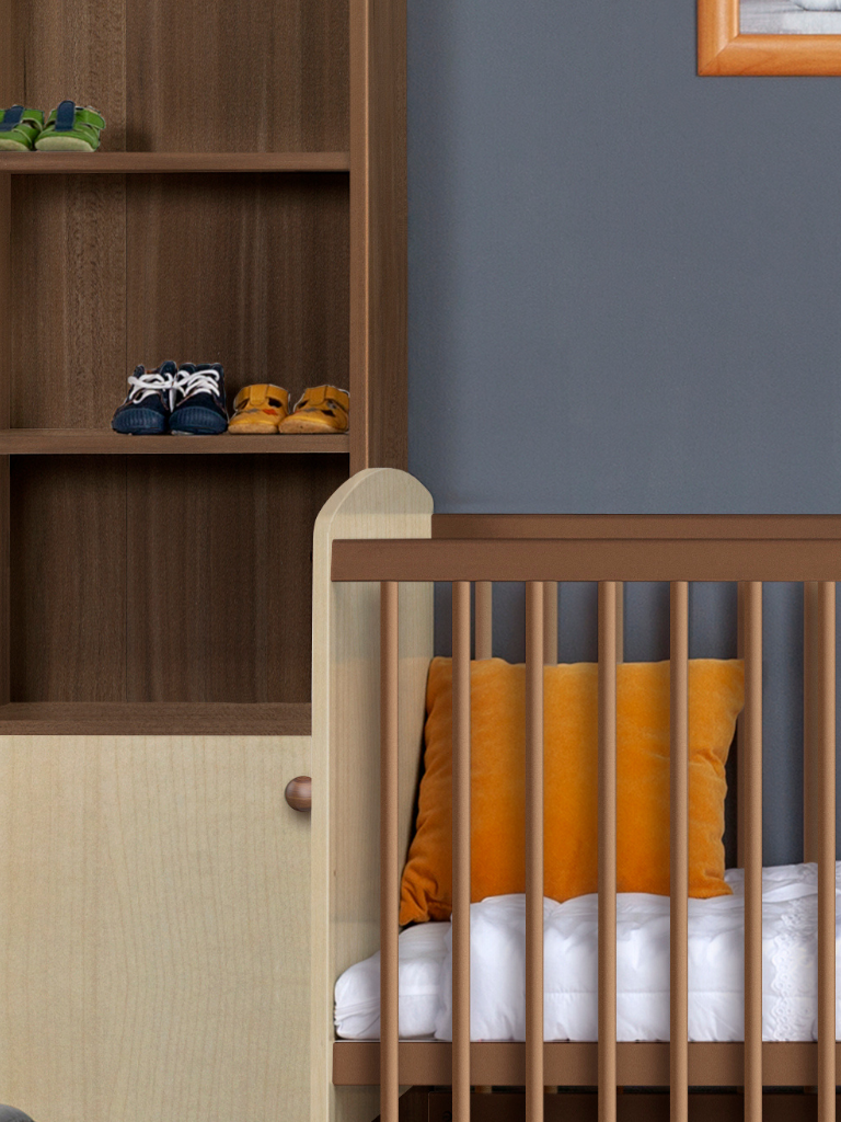 The harmony of plum and maple boards gives the collection its distinctive look, creating a charming atmosphere in any nursery.