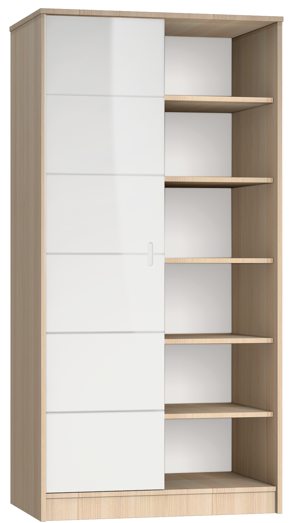 - Materials used: sliding doors in high-gloss painted MDF, combined with Coimbra wood-effect furniture board