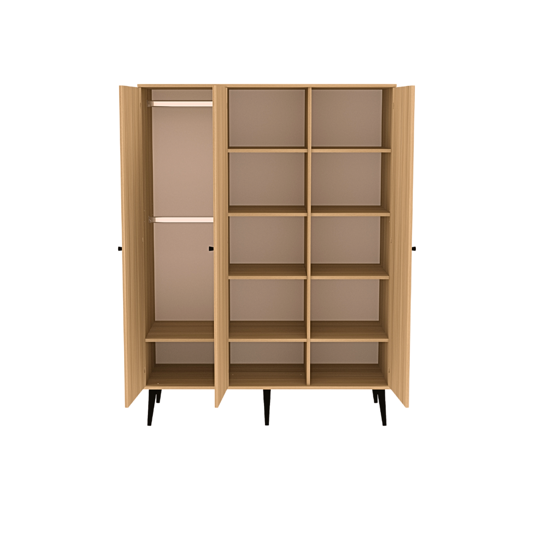 - The left-hand compartment of the wardrobe is primarily designed with a hanging rail, complemented by a shelf at the bottom. If desired, the entire compartment can be fitted with shelves by ordering an additional shelf set.