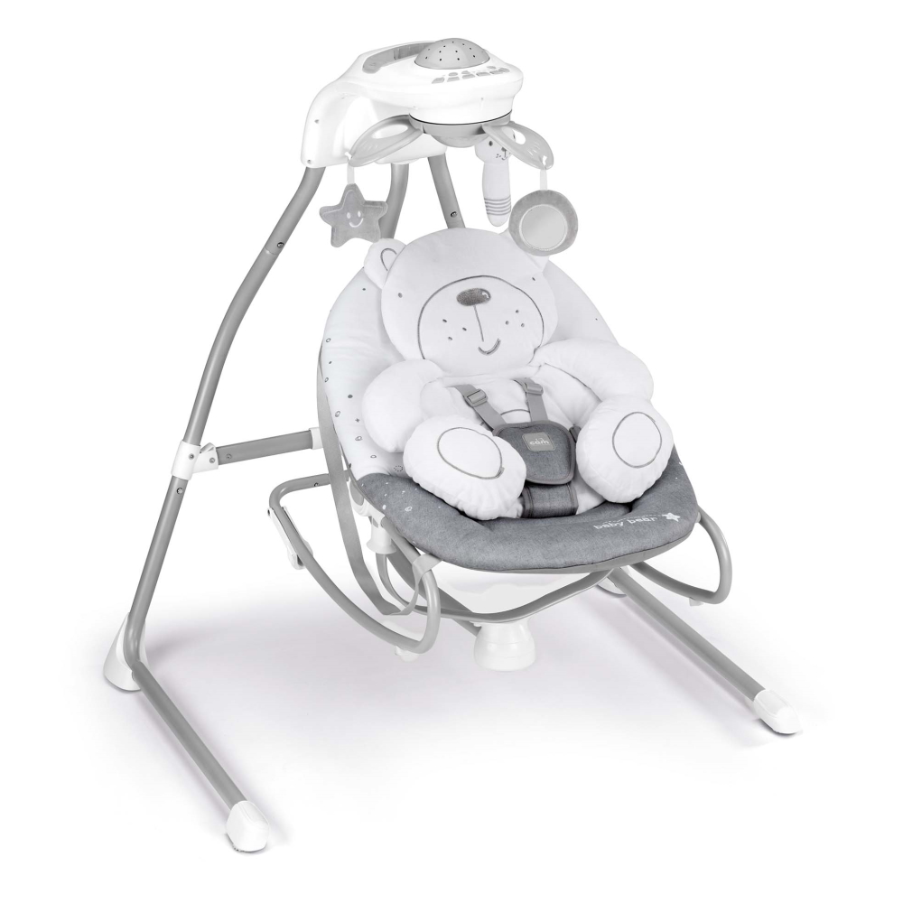 Az elektromos hinta kagylója körülöleli, ringatja, és megnyugtatja a babát. 4 sebességes hinta felfelé vetítő projektorral. 5 dallam és 3 természetes hangot játszik, de akár MP3 lejátszót is rá lehet kötni. A hangereje állítható. Automatikus kikapcsolás-időzítővel rendelkezik (10-20-30 perc).