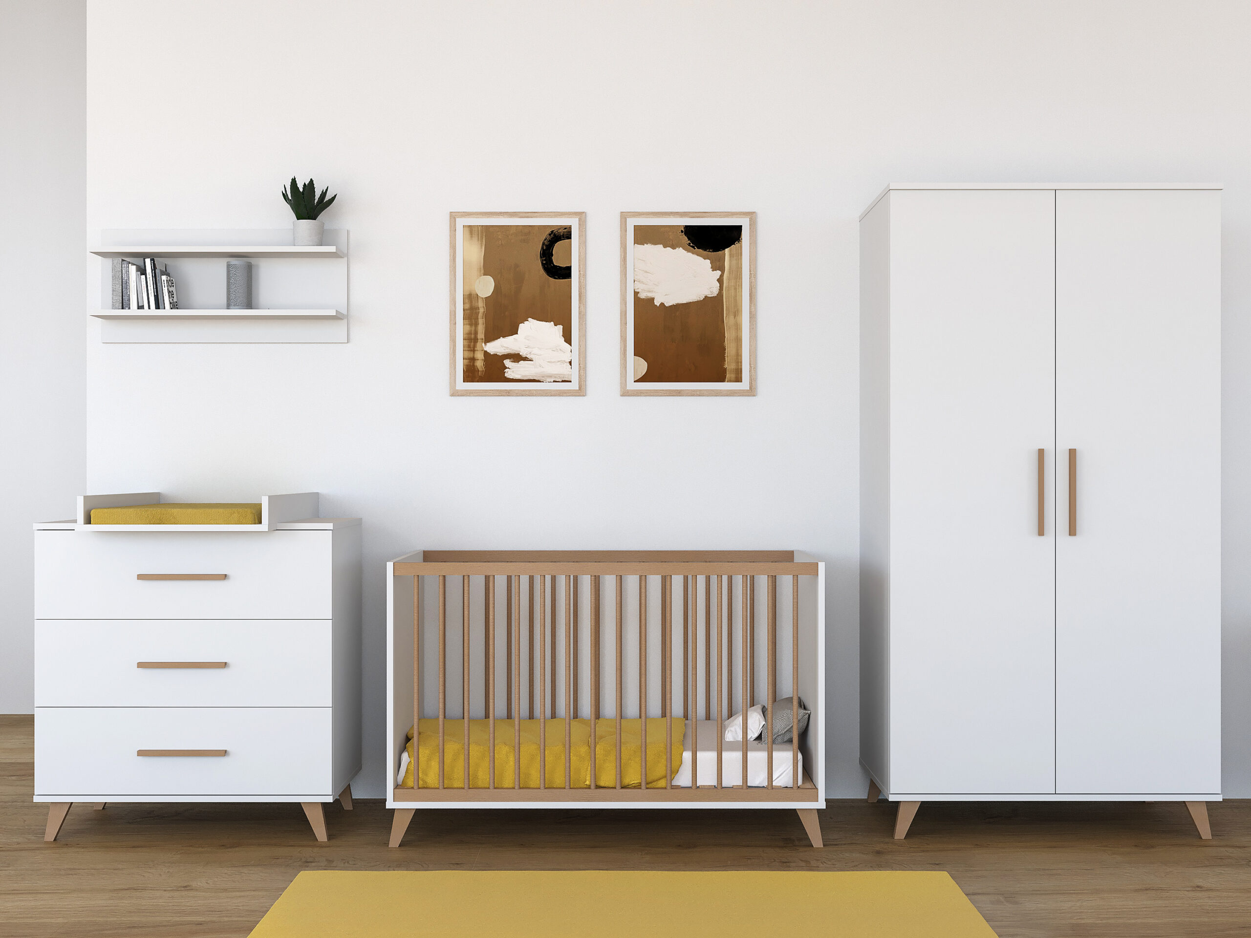- 2 hanging rails and 2 fixed shelves are available for arranging your baby’s belongings.