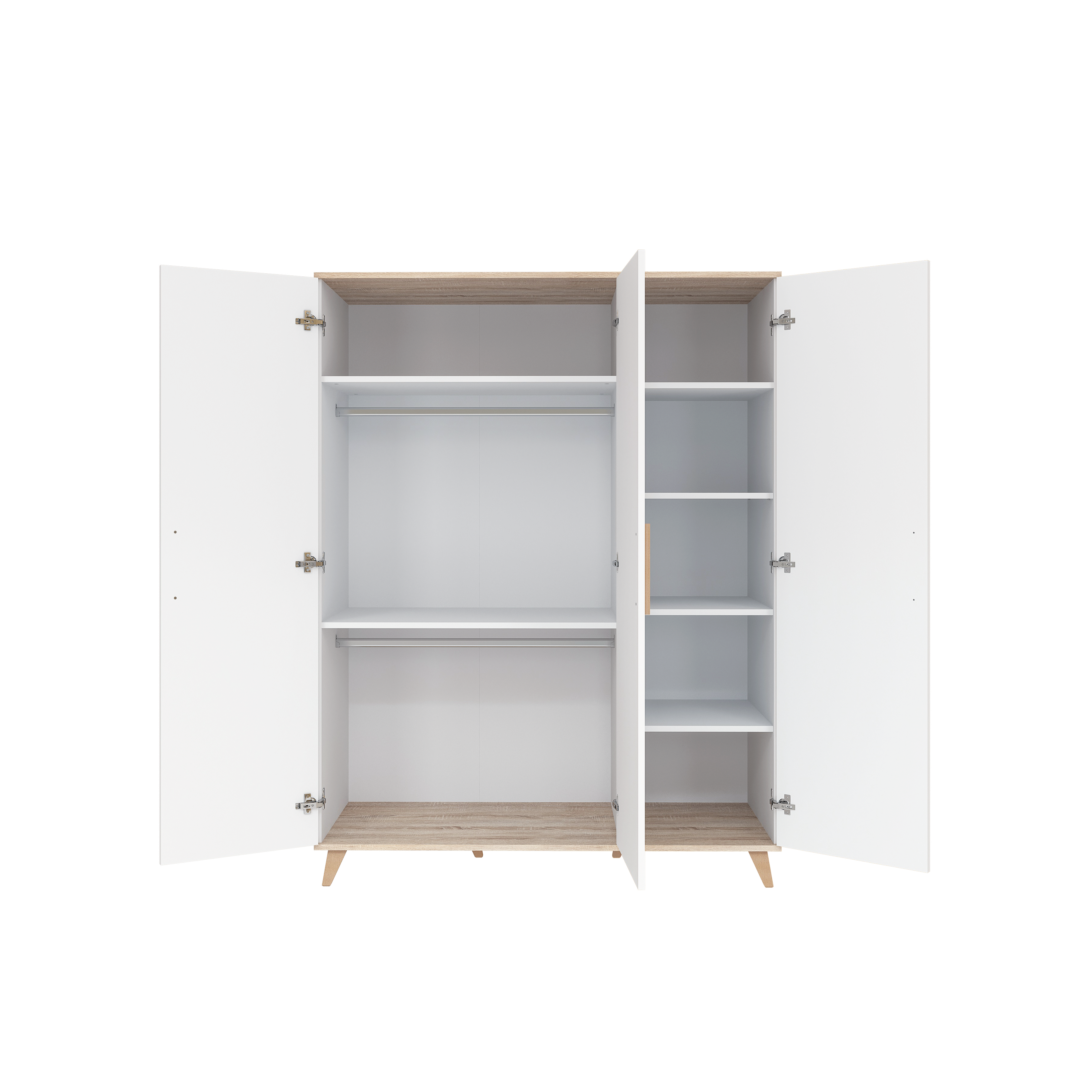 The FLIP White & Oak Wardrobe XL is the perfect solution for those who plan long-term and wish to provide ample storage space for their child’s belongings. In the two larger compartments, two fixed shelves and two hanging rails help organise clothes efficiently, while the third compartment is fully equipped with shelves – four in total – offering plenty of room for accessories, toys, or folded clothes.