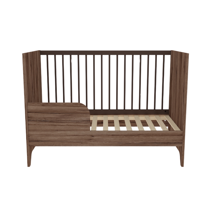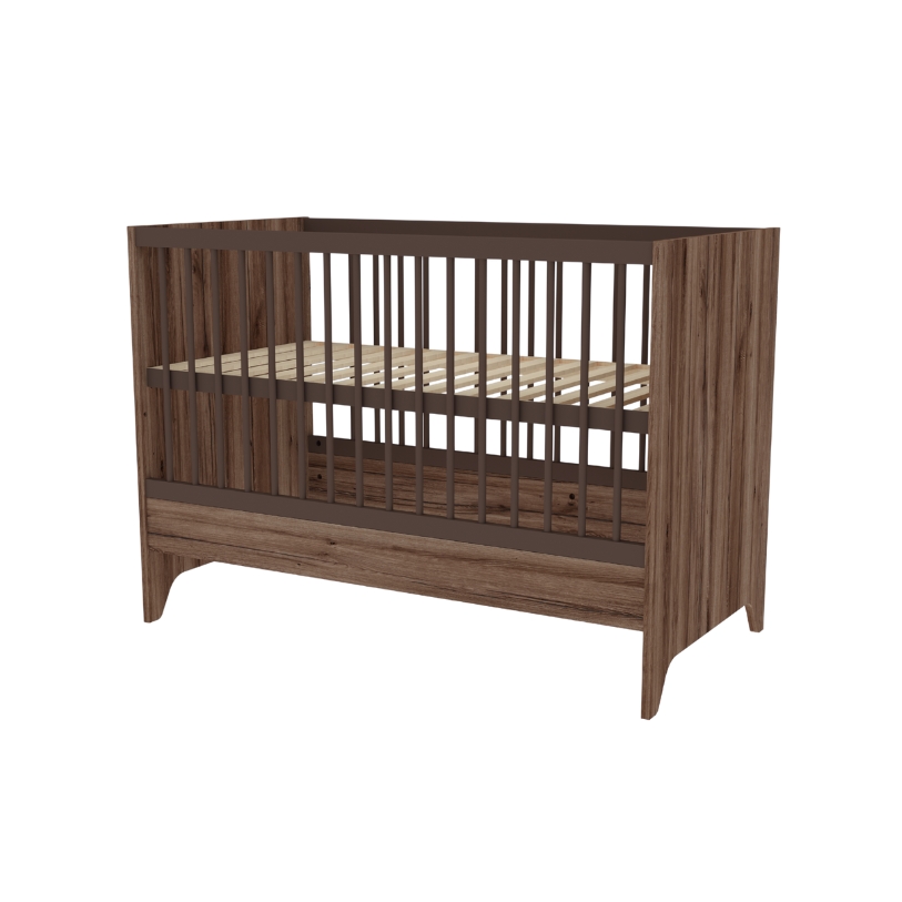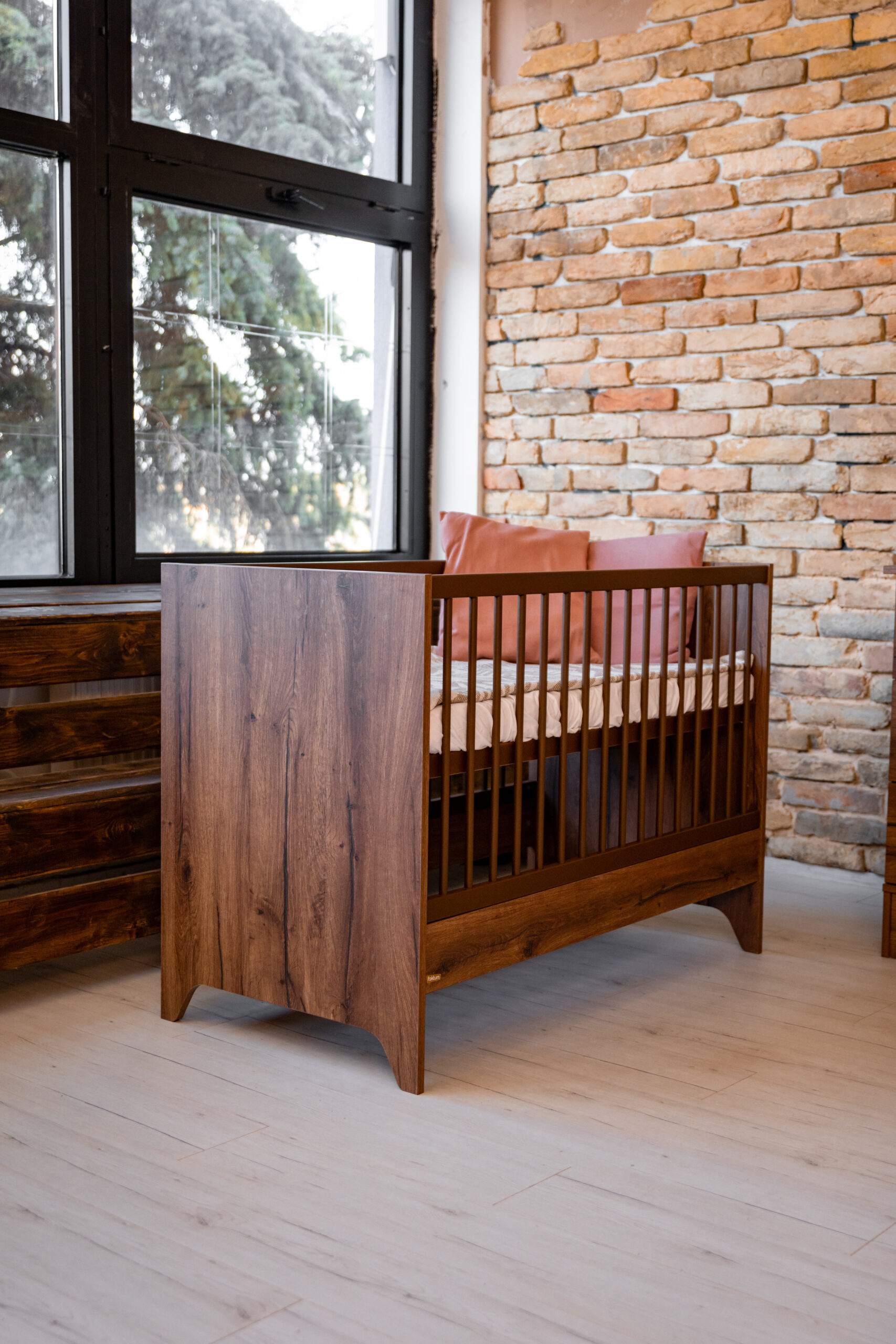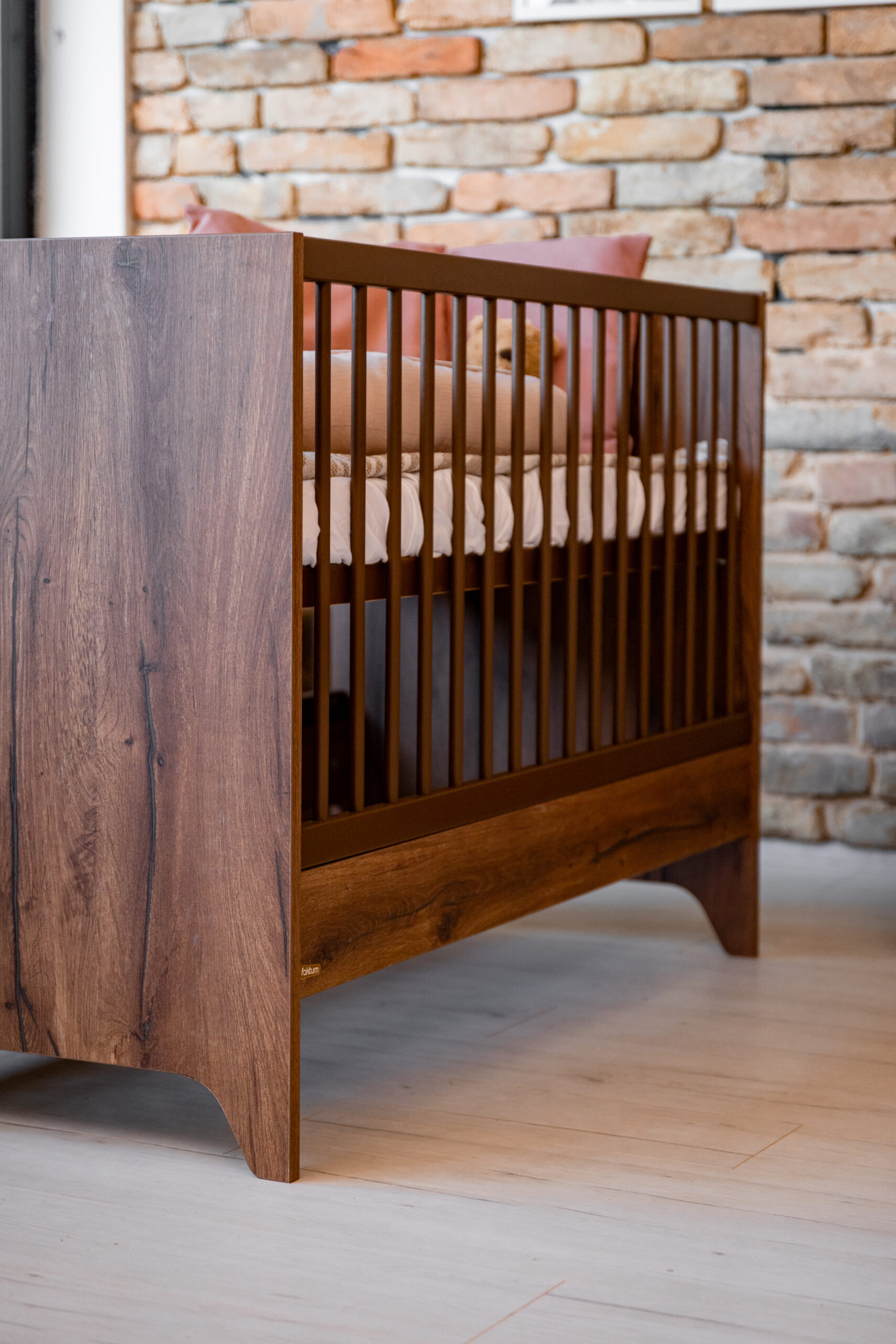 The Nest Walnut 120 baby cot is an essential element of the modern nursery. The deep walnut shade of the furniture board is adorned with distinctive black grain patterns, giving the piece a natural look and unique character.
