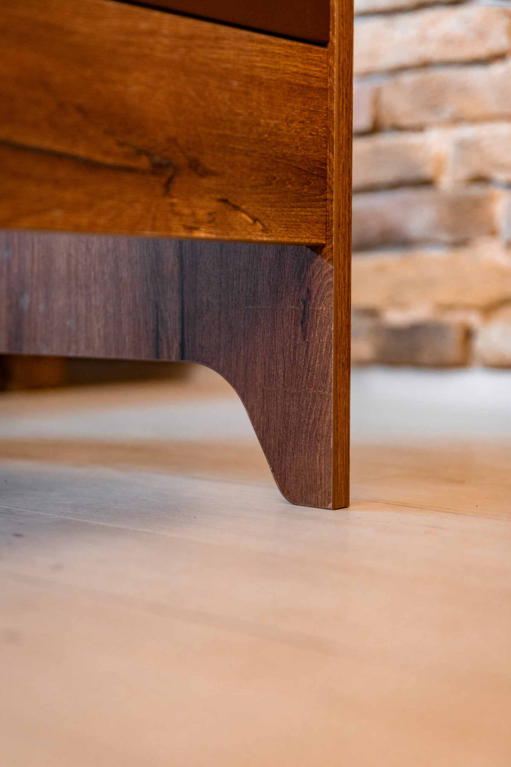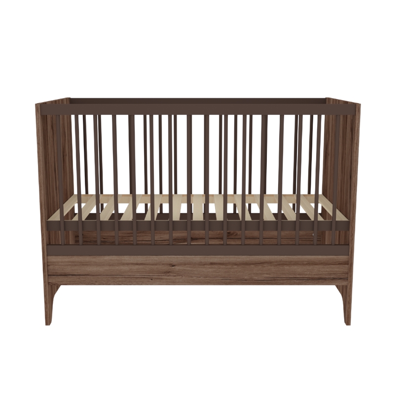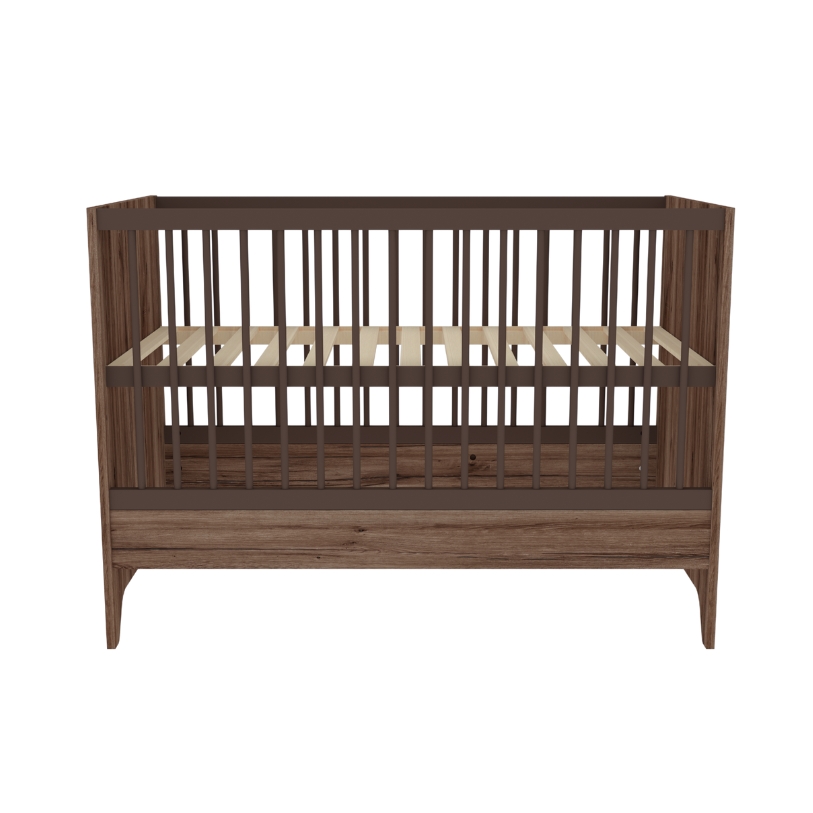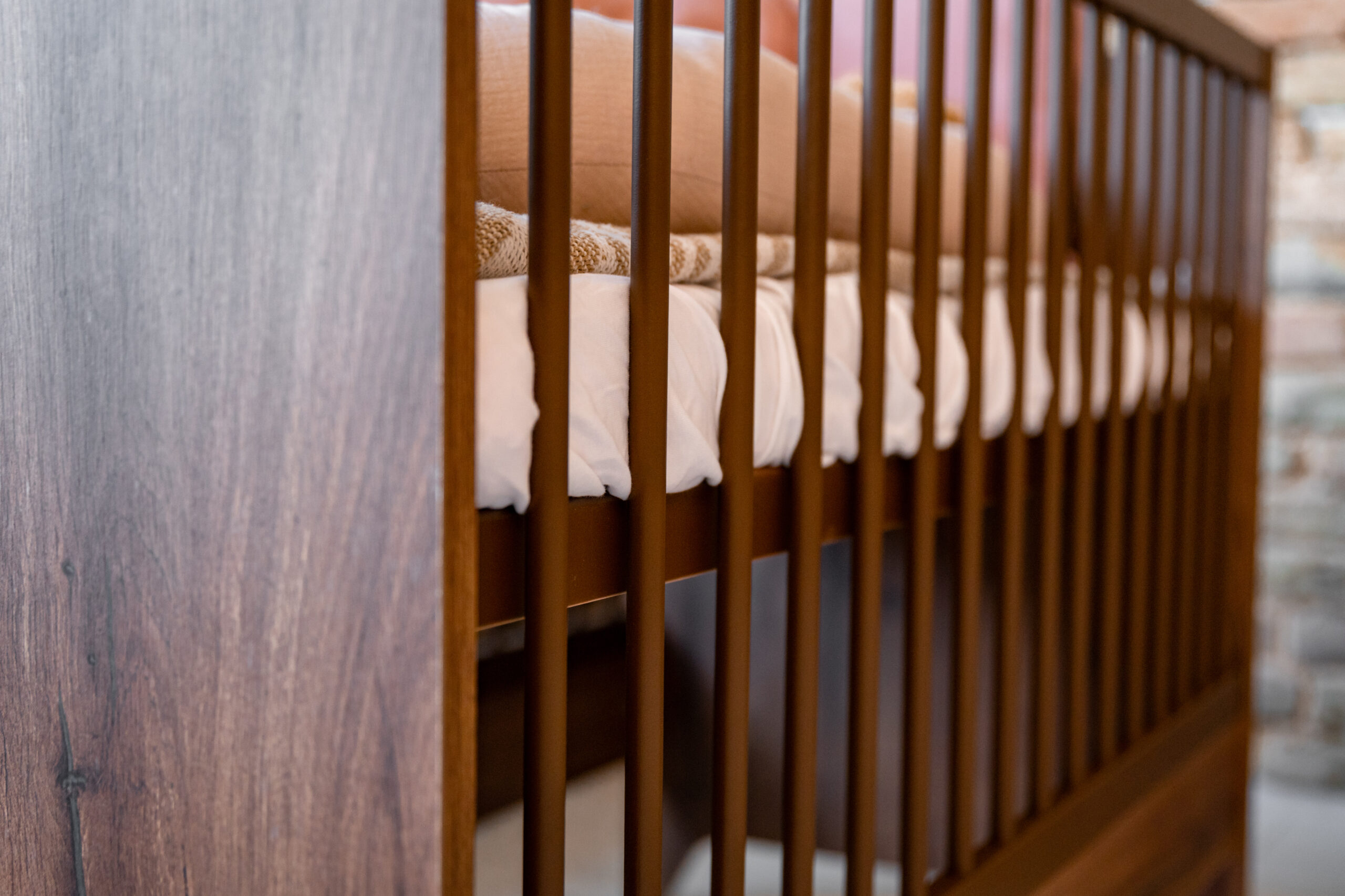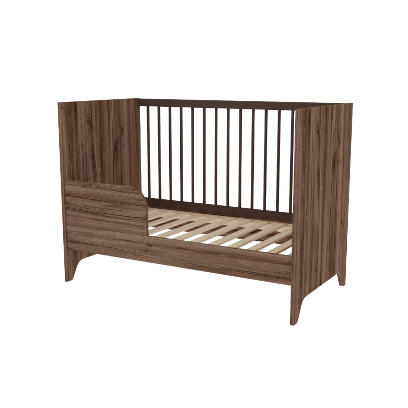 The Nest Walnut 120 baby cot is an essential element of the modern nursery. The deep walnut shade of the furniture board is adorned with distinctive black grain patterns, giving the piece a natural look and unique character.