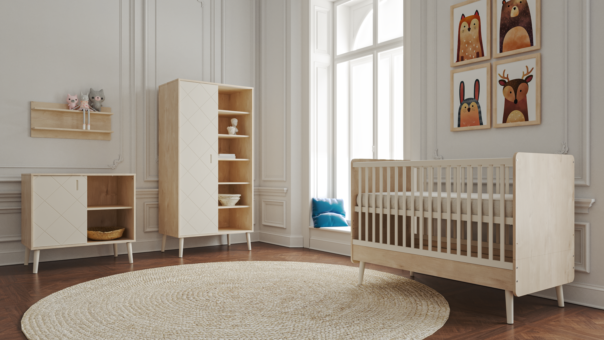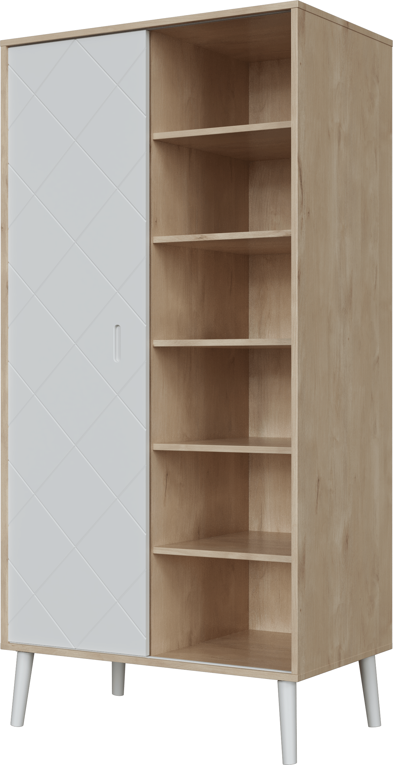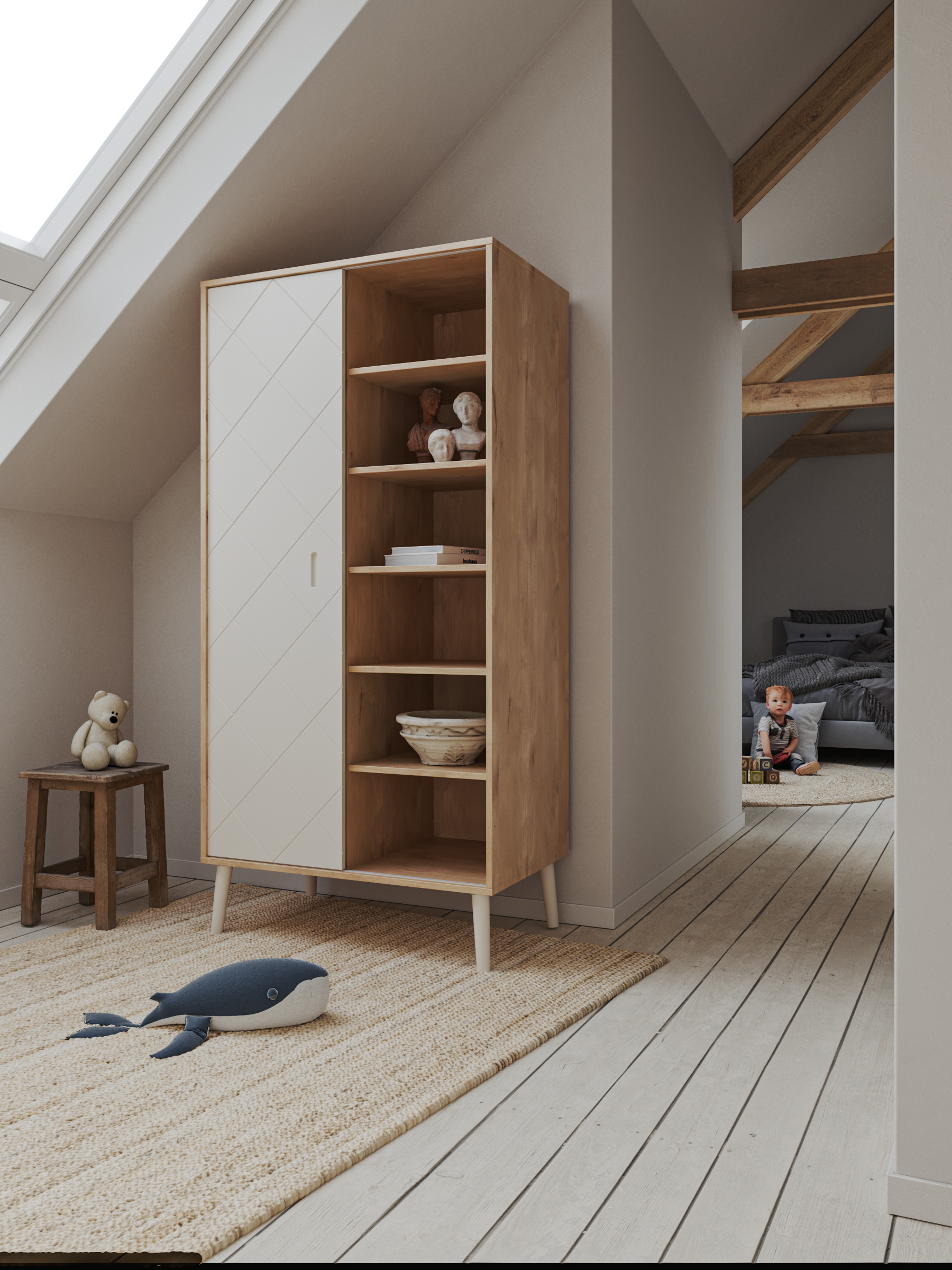 The 2-part wardrobe is an excellent choice, as it fits the child's initial belongings. It can be perfectly varied with the other elements of the furniture family, which can be used to create a children's room that will never get boring for children. The inner packing surface of the cabinet can be converted into a hanging or shelf version as required. Moreover, if necessary, it is also possible to order an extra shelf. The front of the product is made of painted MDF with a silk sheen, while the rest of the furniture is made of chipboard.