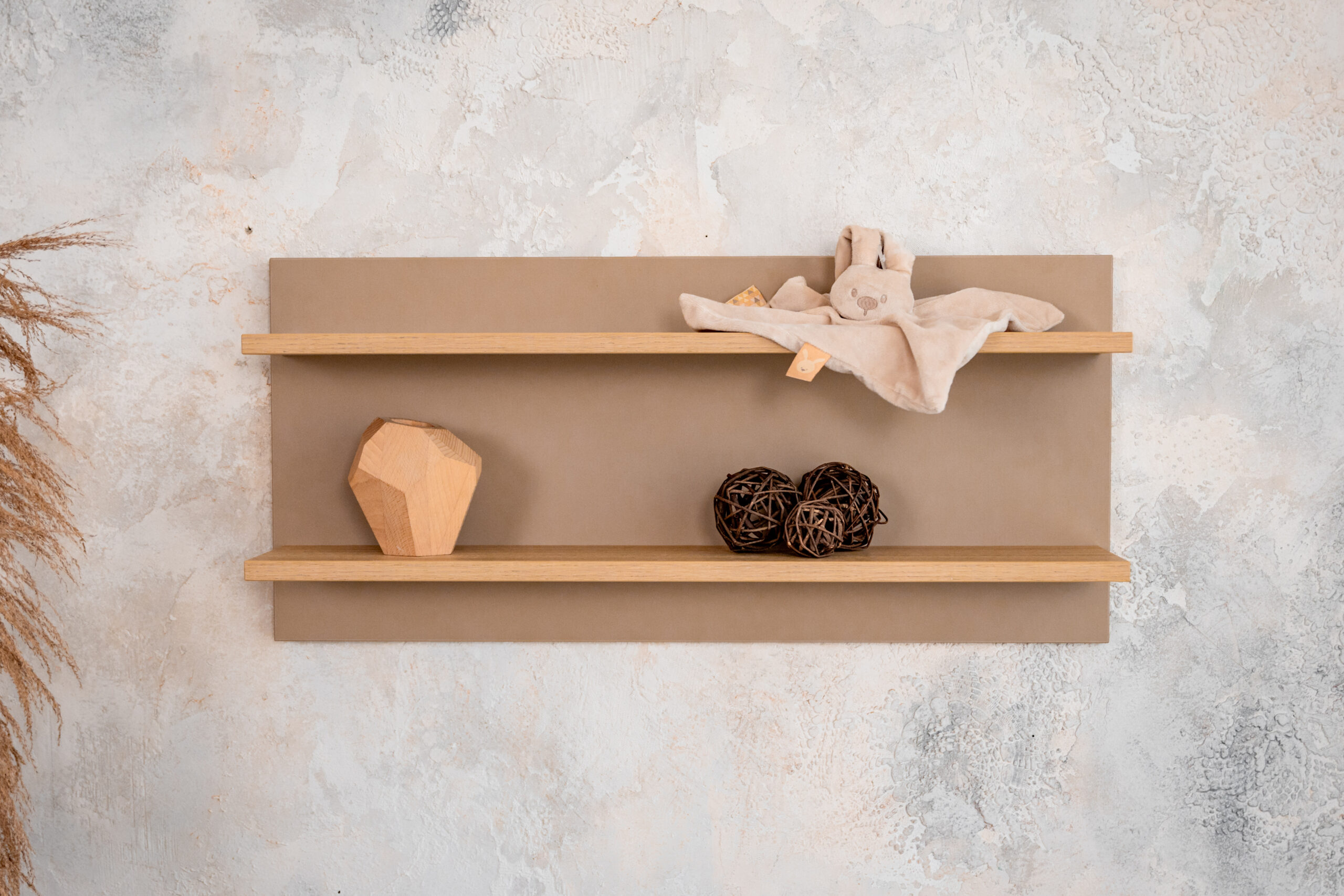 The wall shelf features two spacious shelves, keeping all essential baby items within easy reach during diaper changes and daily care. It also saves space and serves as a practical addition, completing the harmony of the nursery.
