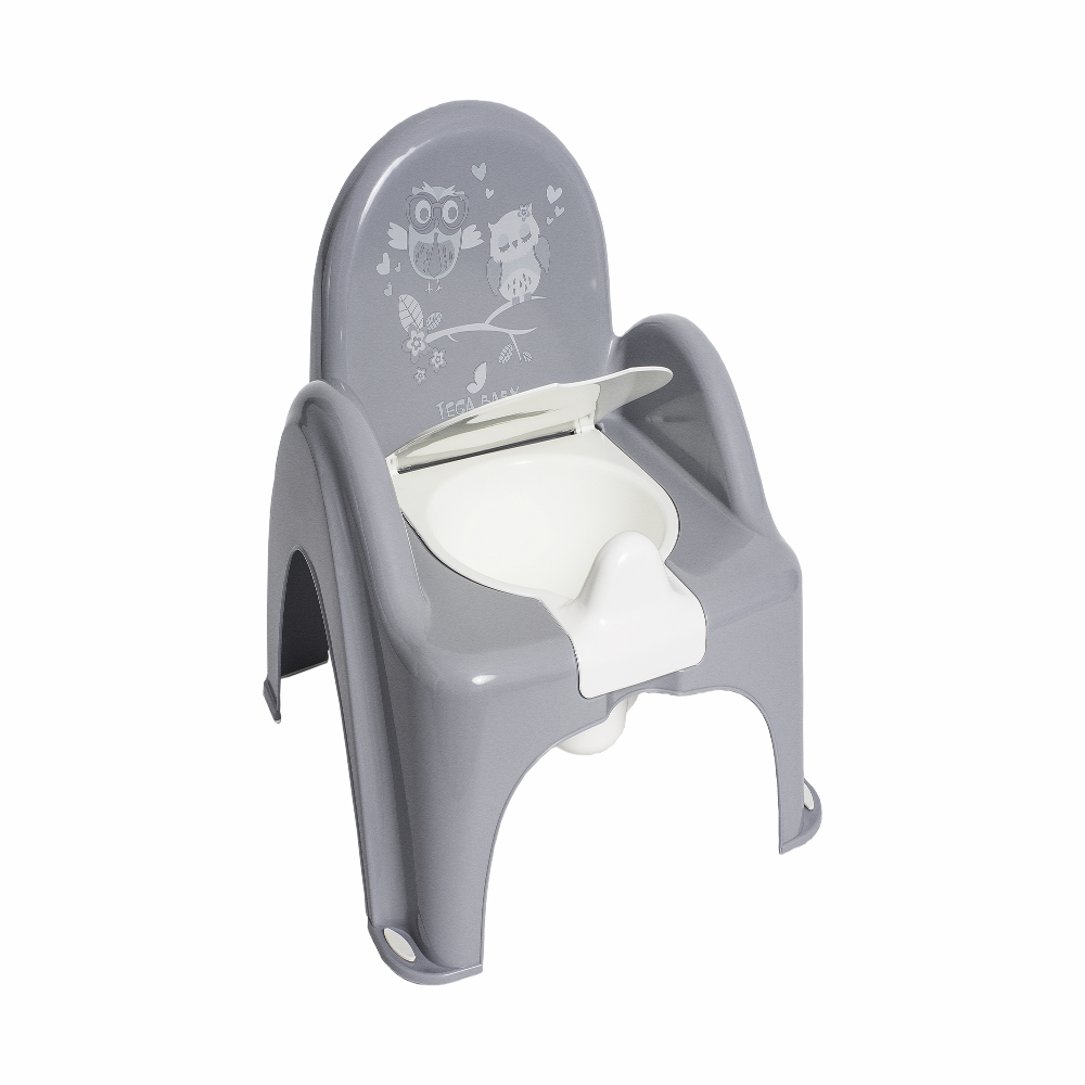 Magas háttámlával, kivehető betéttel és lehajtható fedéllel rendelkező, csúszásgátlós bili.