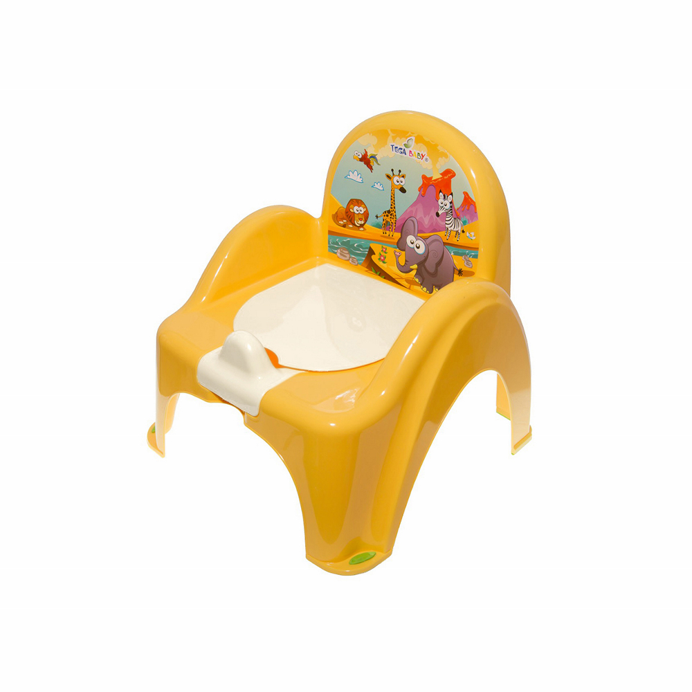 Magas háttámlával, kivehető betéttel és lehajtható fedéllel rendelkező, csúszásgátlós bili.