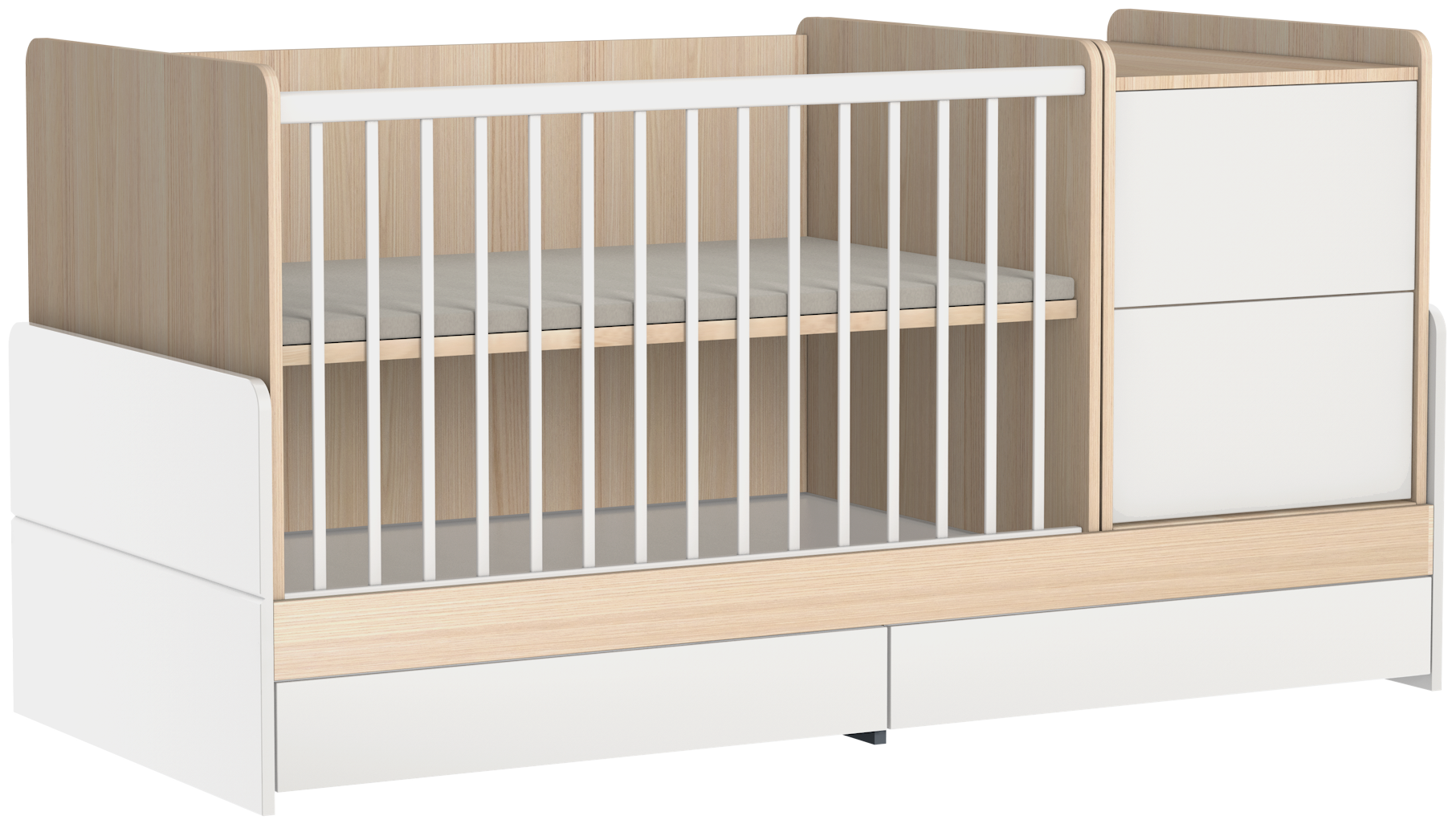 A legsokoldalúbb gyermekágyunk. Amellett, hogy a kezdeti időszakban babaágy és pelenkázó komód egyben, később még ifjúsági ággyá, valamint íróasztallá is alakítható.
