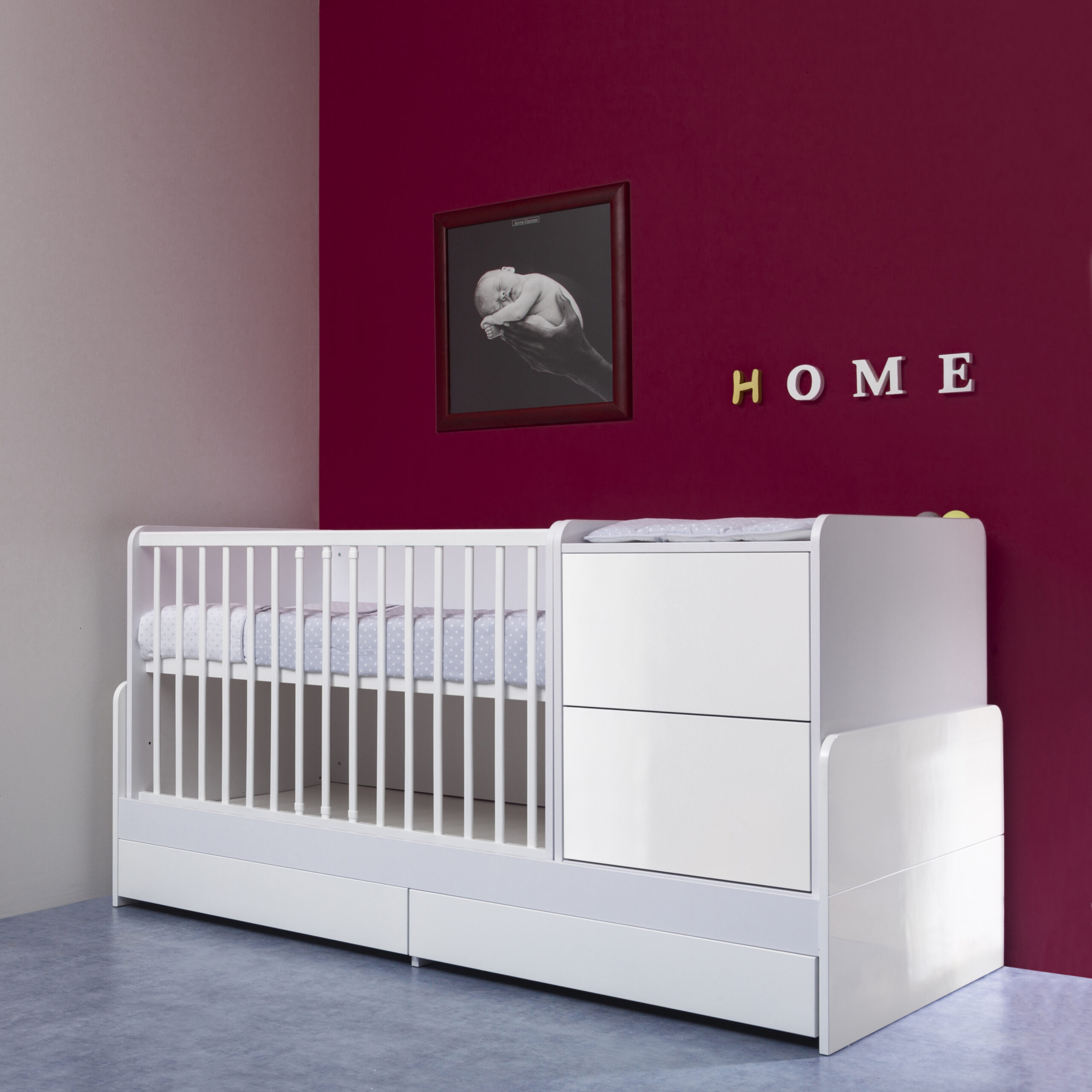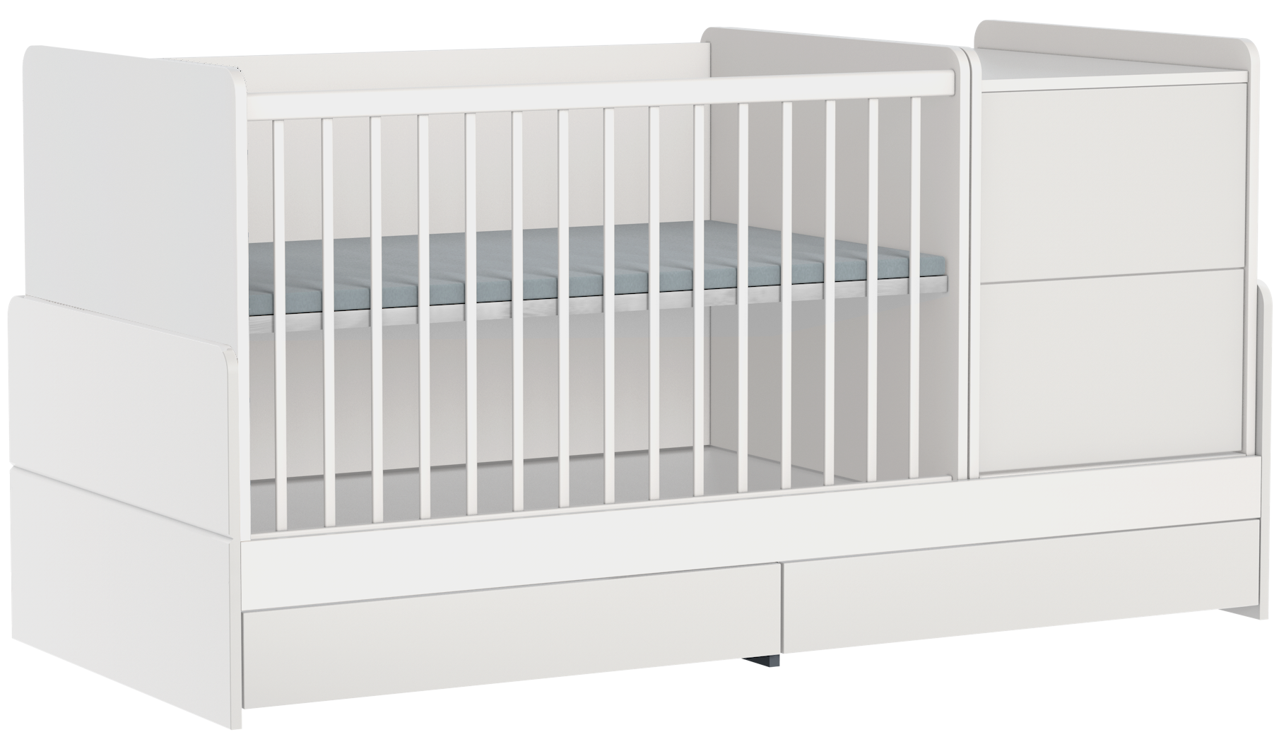 A legsokoldalúbb gyermekágyunk. Amellett, hogy a kezdeti időszakban babaágy és pelenkázó komód egyben, később még ifjúsági ággyá, valamint íróasztallá is alakítható.