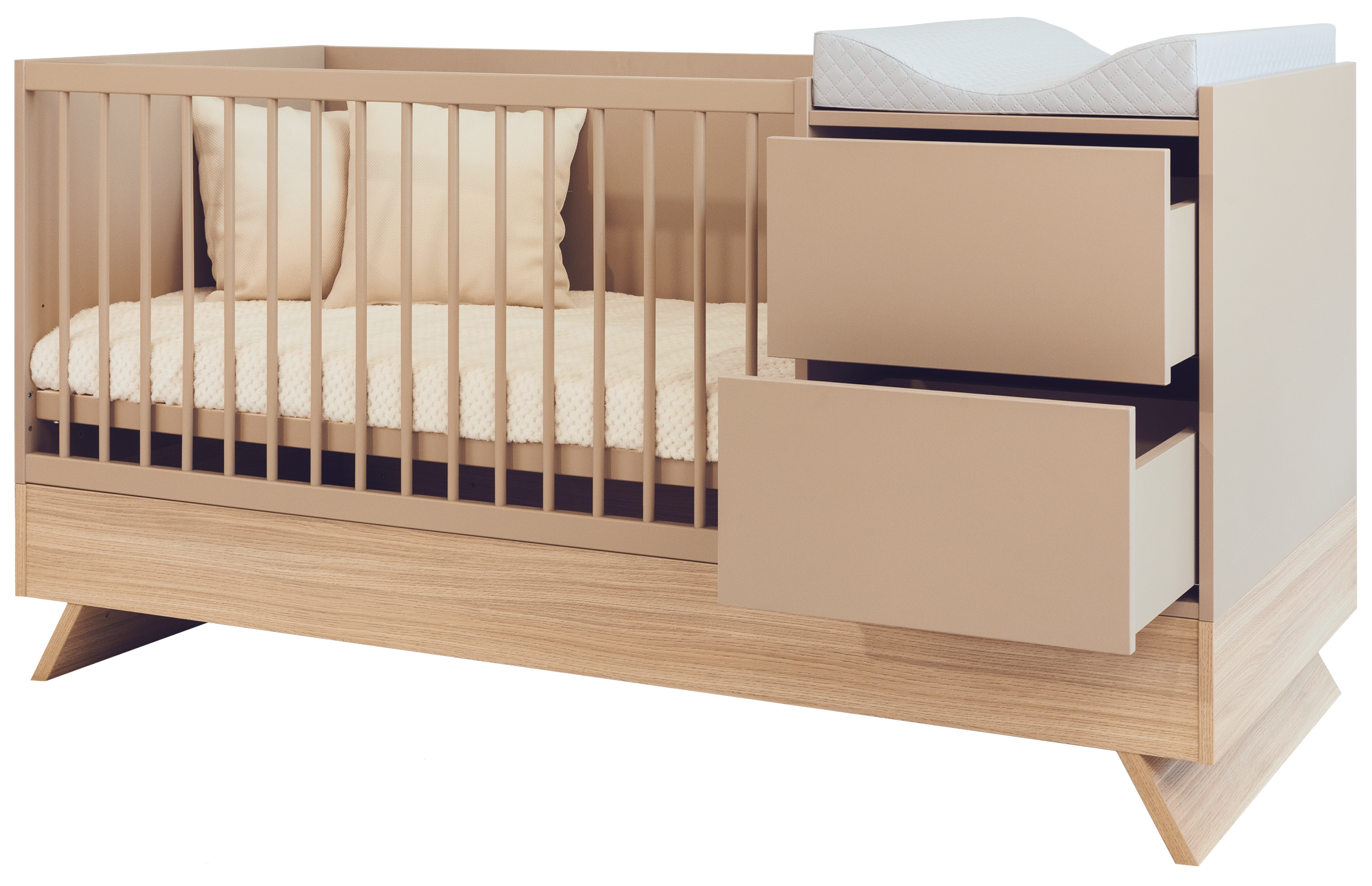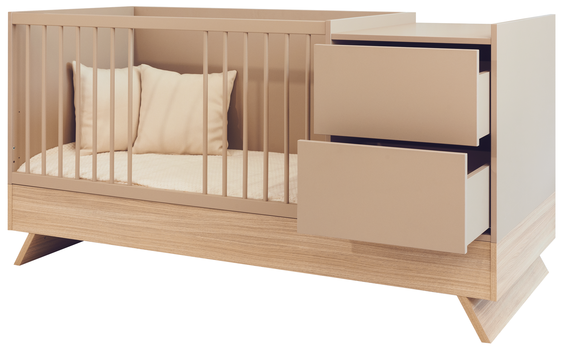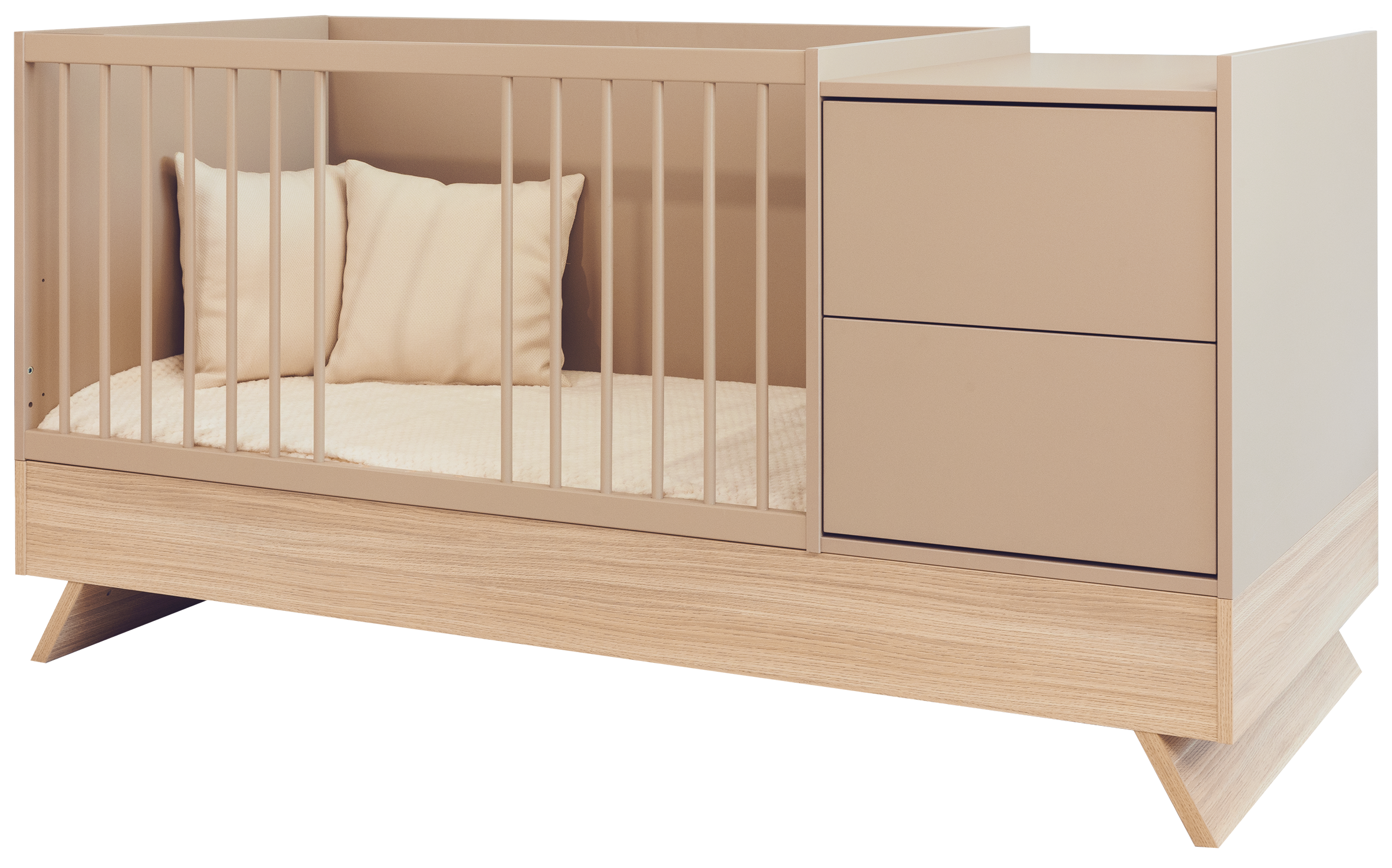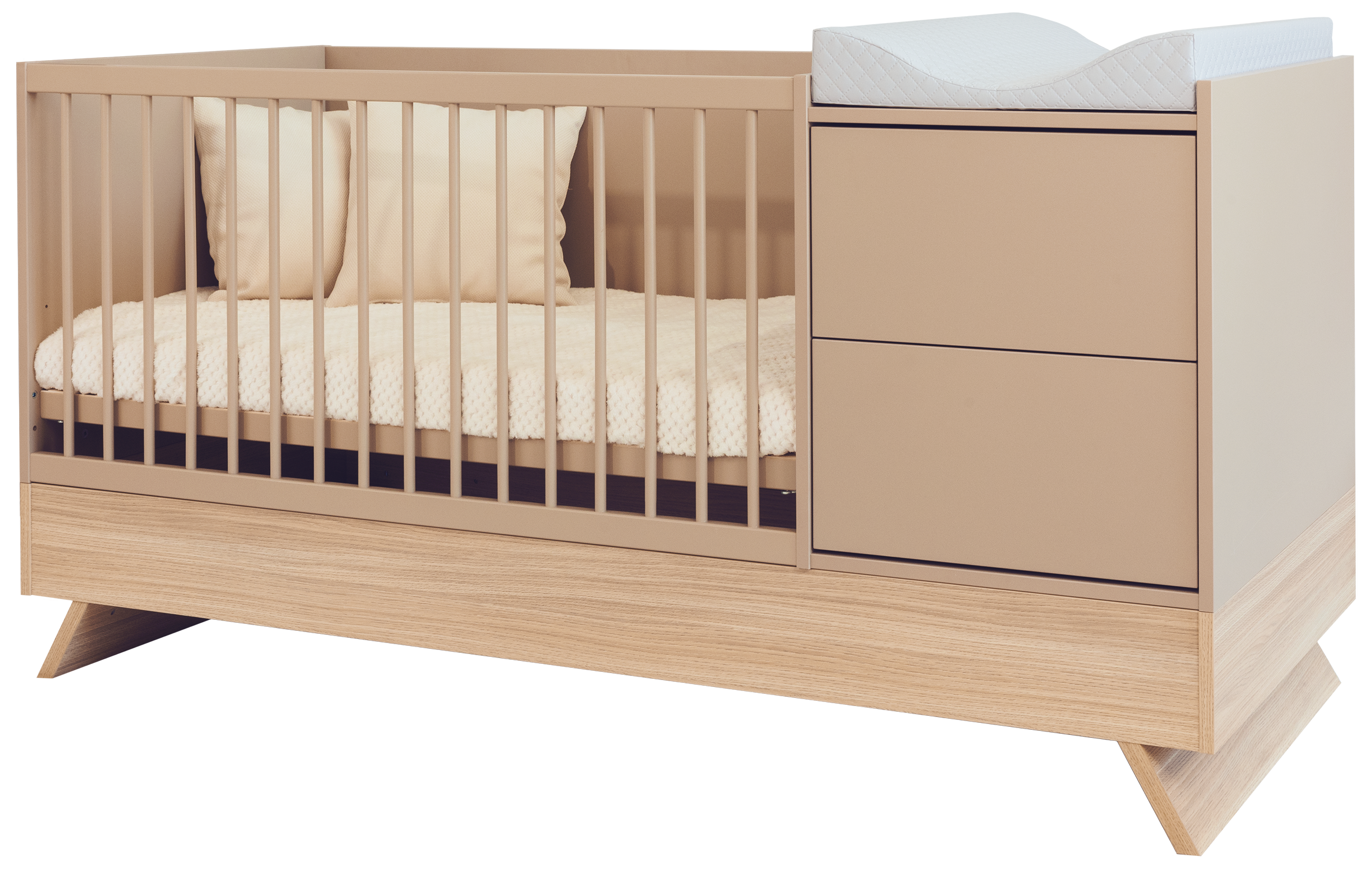 A Sienna Cappuccino bútorcsalád új tagja nem csupán szemet gyönyörködtető megjelenésével hódít, hanem kifinomult, átgondolt funkcióival is meggyőz. A dylan tölgy lábakon álló kombi babaágy elegáns cappuccino bútorlappal egészül ki, amely tökéletes harmóniát teremt a természetes és modern stílus között.