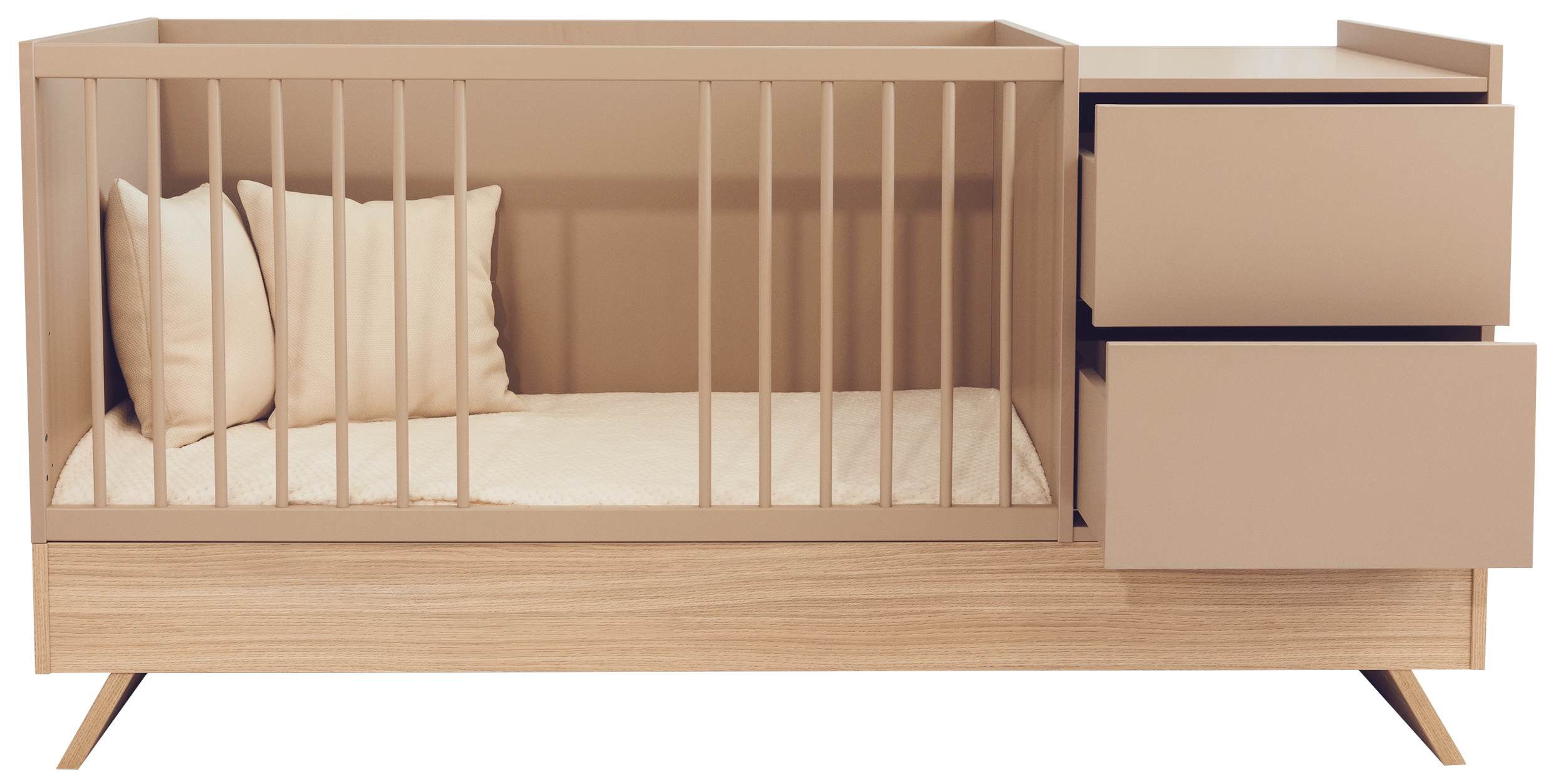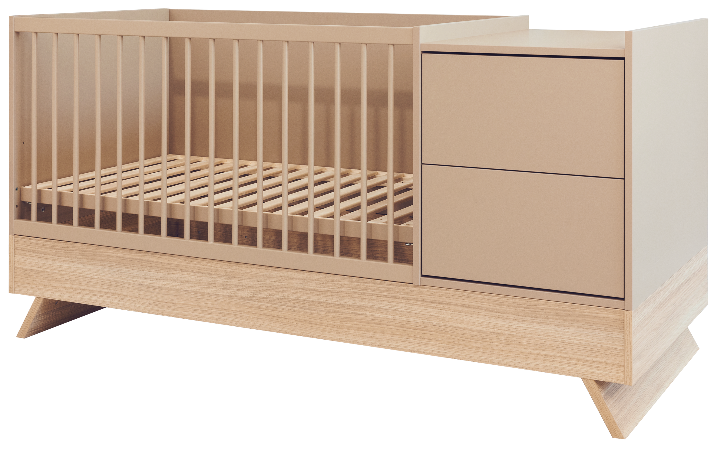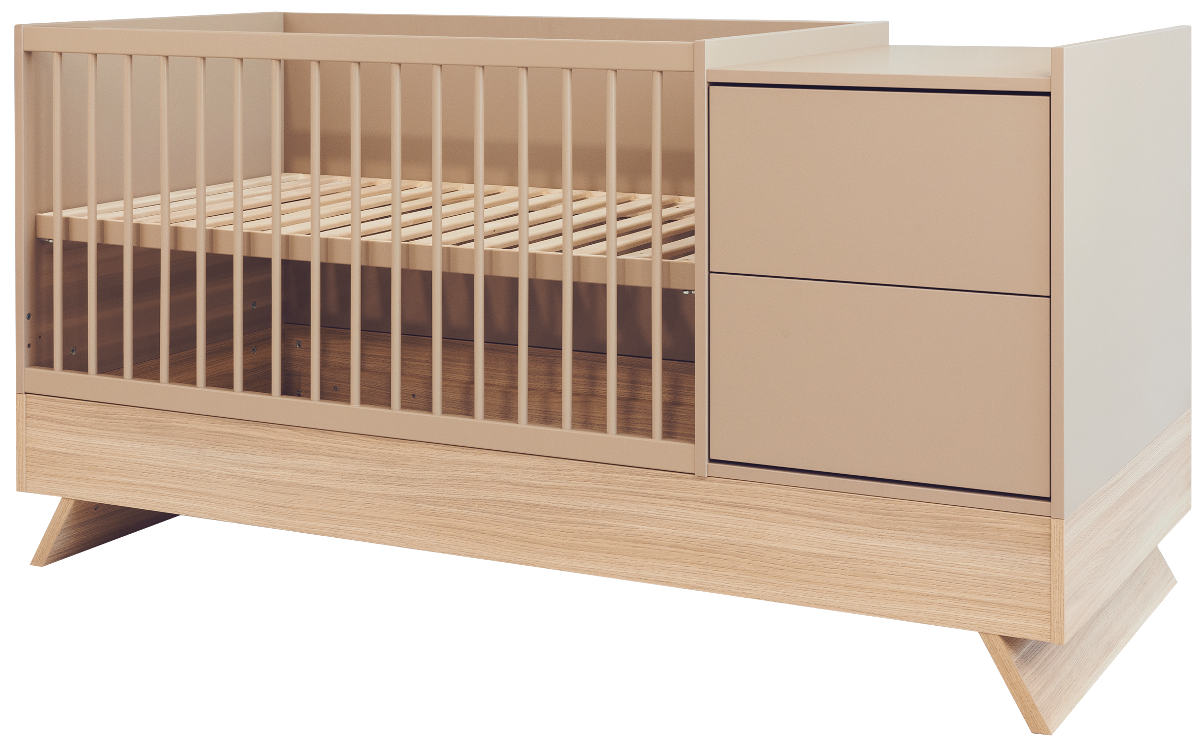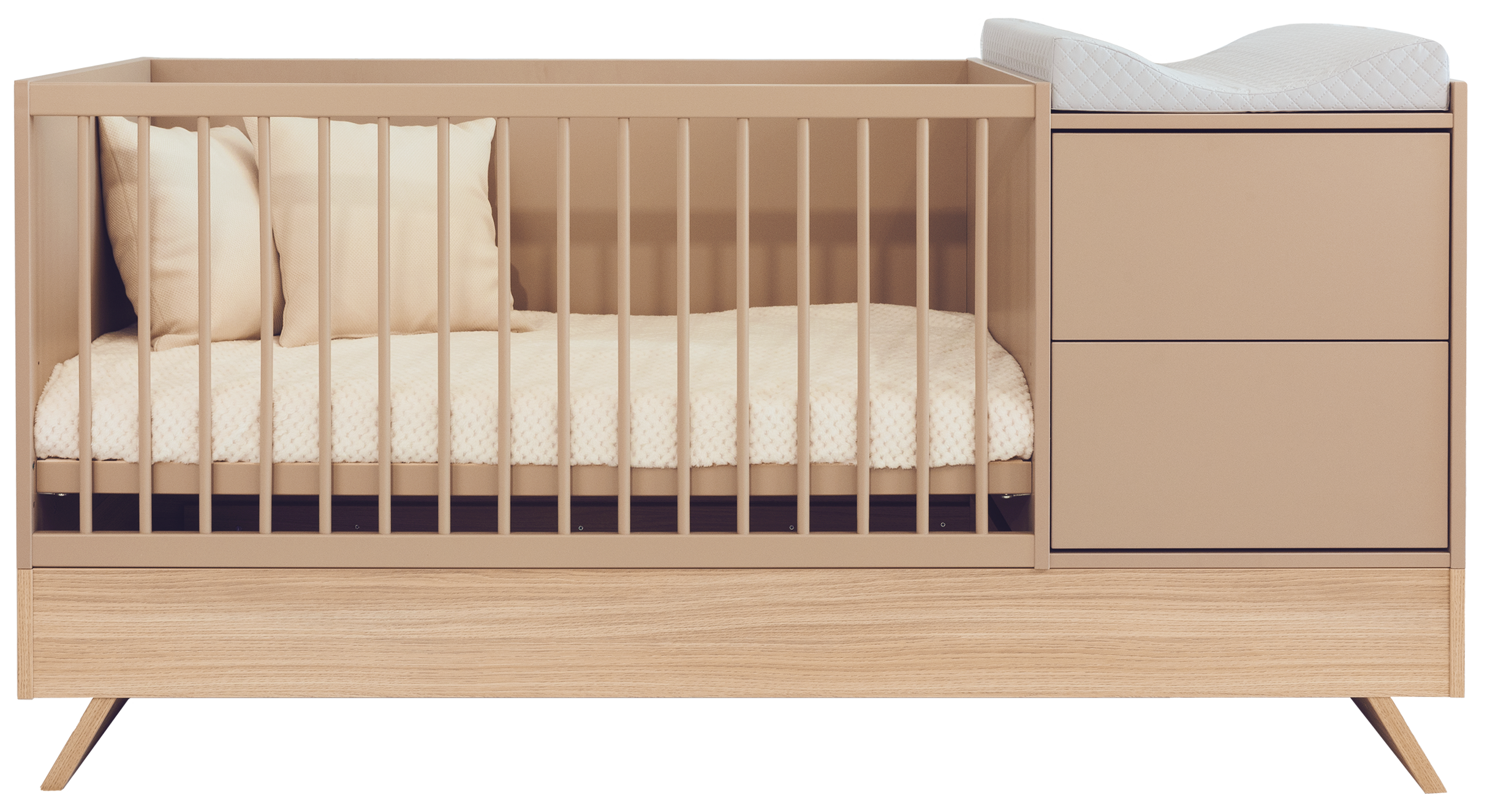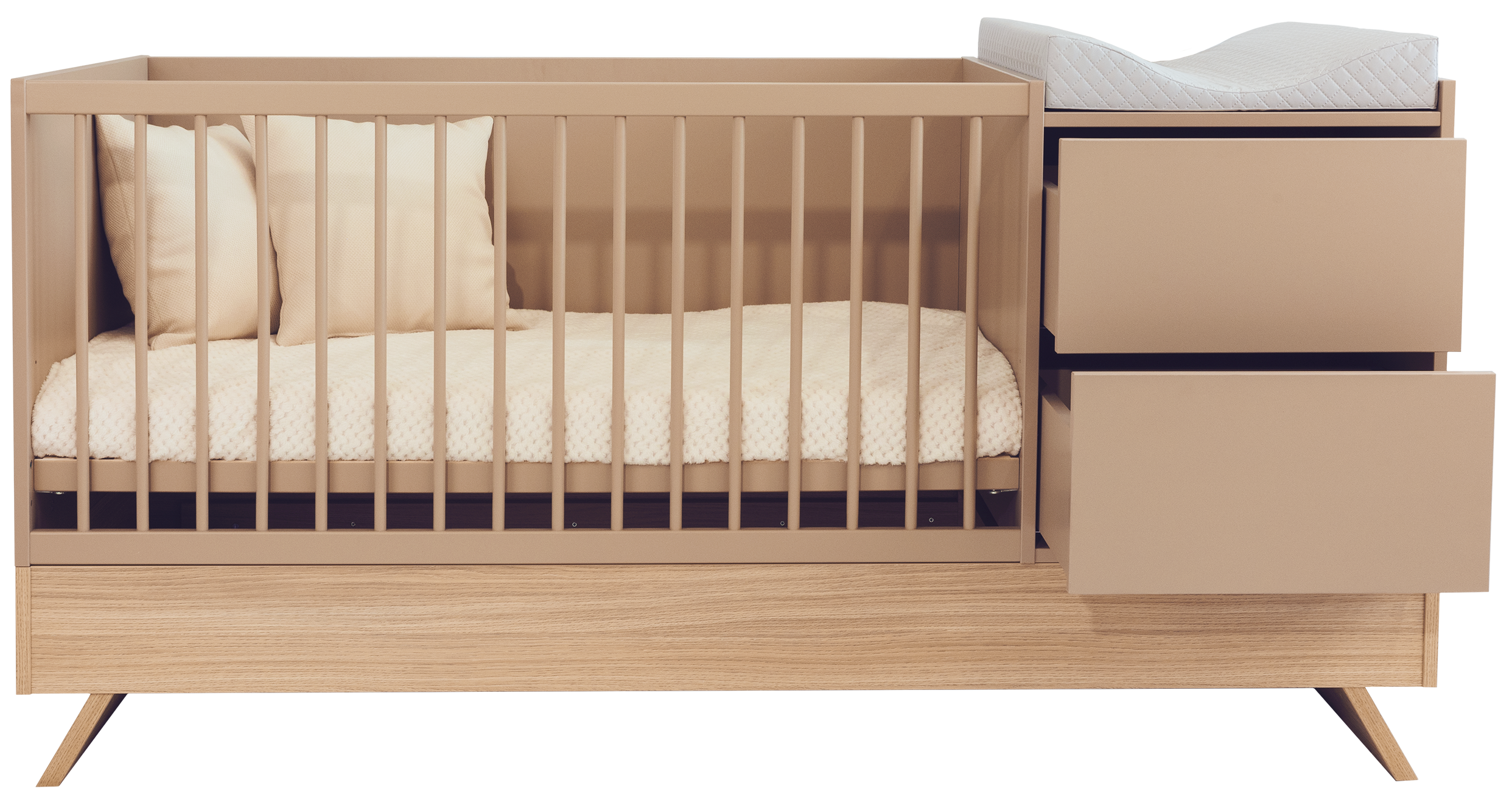 A Sienna Cappuccino bútorcsalád új tagja nem csupán szemet gyönyörködtető megjelenésével hódít, hanem kifinomult, átgondolt funkcióival is meggyőz. A dylan tölgy lábakon álló kombi babaágy elegáns cappuccino bútorlappal egészül ki, amely tökéletes harmóniát teremt a természetes és modern stílus között.